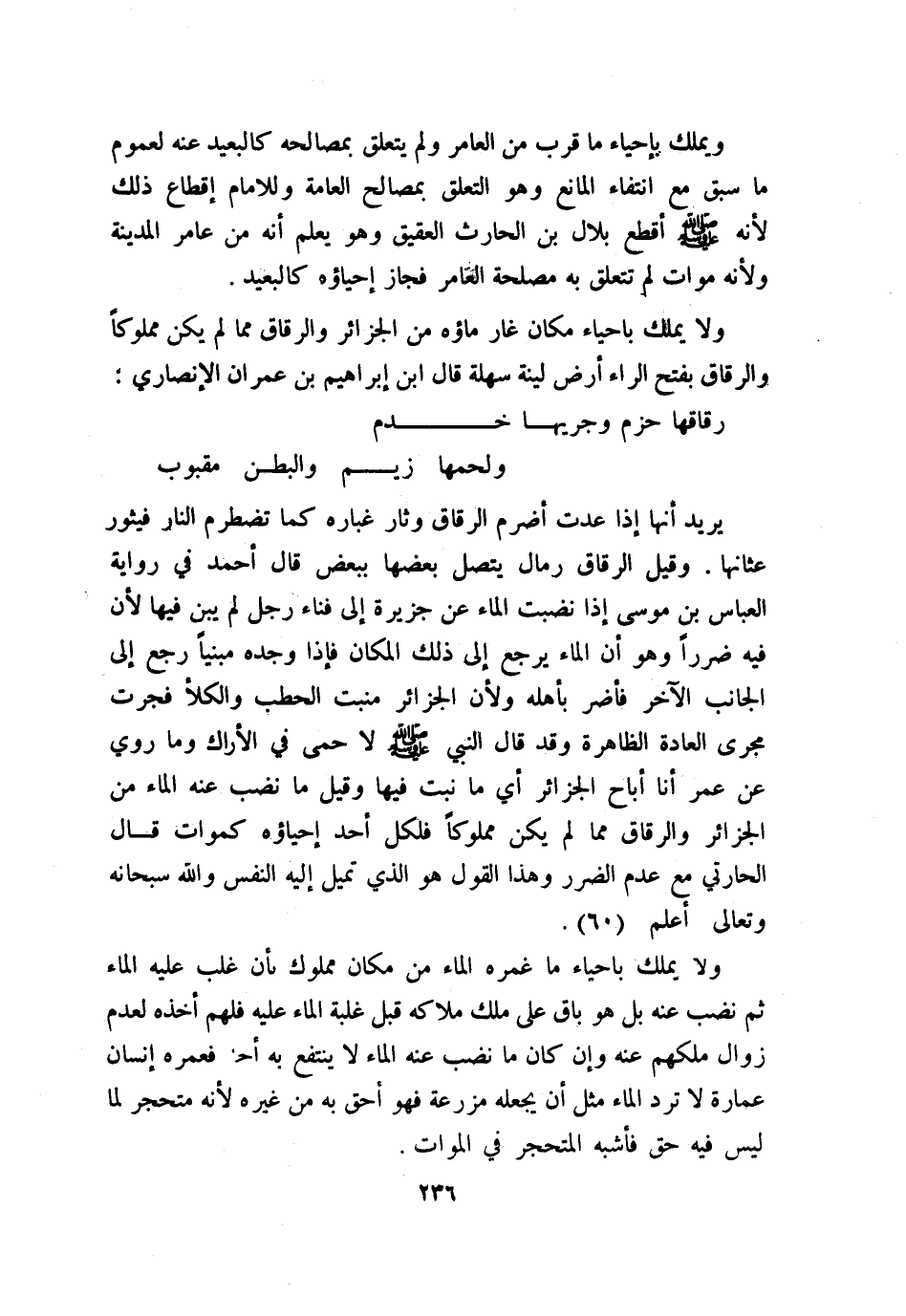 ولا يملك بإحياء مكان غار ماؤه من الجزائر والرفاق مما لم يكن مملوكًا والرقاق بفتح الراء أرض لينة سهلة، قال ابن إبراهيم بن عمران الأنصاري: