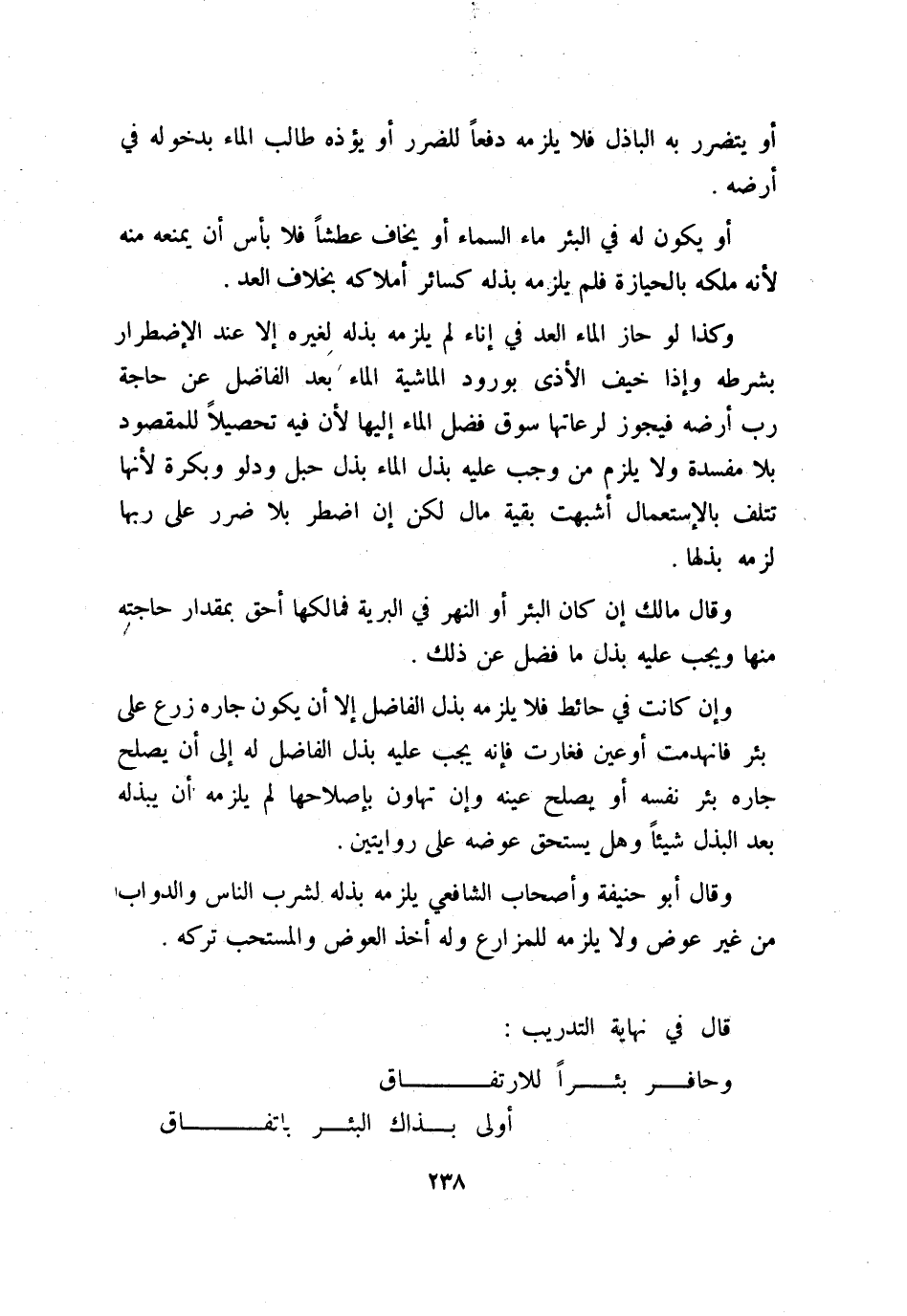 وقال مالك: إن كان البئر أو النهر في البرية فمالكها أحق بمقدار حاجته منها ويجب عليه بذل ما فضل عن ذلك.