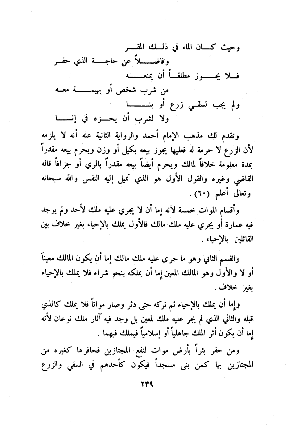 وأقسام الموات خمسة؛ لأنه إما أن لا يجري عليه ملك لأحد ولم يوجد فيه عمارة أو يجري عليه ملك مالك، فالأول يملك بالإحياء بغير خلاف بين القائلين بالإحياء.