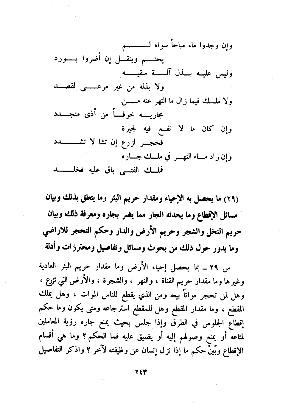 (29) ما يحصل به الإحياء، ومقدار حريم البئر وما يتعلق بذلك، وبيان مسائل الإقطاع، وما يحدثه الجار مما يضر بجاره ومعرفة ذلك، وبيان حريم النخل والشجر وحريم الأرض والدار، وحكم التحجر للأراضي، وما يدول