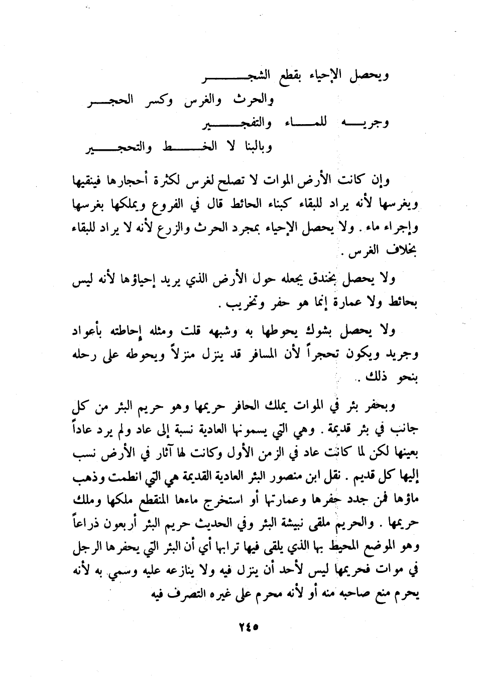 وبحفر بئر في الموات يملك الحافر حريمها وهو حريم البئر من كل جانب في بئر قديمة، وهي التي يسمونها العادية نسبة إلى عاد ولم يرد عادًا بعينها، لكن لما كانت عاد في الزمن الأول وكانت لها آثار في الأرض نسب إليها كل قديم، نقل ابن منصور البئر العادية القديمة: هي التي انطمت وذهب ماؤها فمن جدد حفرها وعمارتها أو استخرج ماءها المنقطع ملكها ومنلك حريمها، والحريم ملقى نبيشة البئر، وفي الحديث: «حريم البئر أربعون ذراعًا» وهو الموضع المحيط بها الذي يلقى فيها ترابها، أي أن البئر التي يحفرها الرجل في موات فحريمها ليس لأحد أن ينزل فيه، ولا ينازعه عليه، وسمي به؛ لأنه يحرم منع صاحبه منه أو لأنه محرم على غيره التصرف فيه.