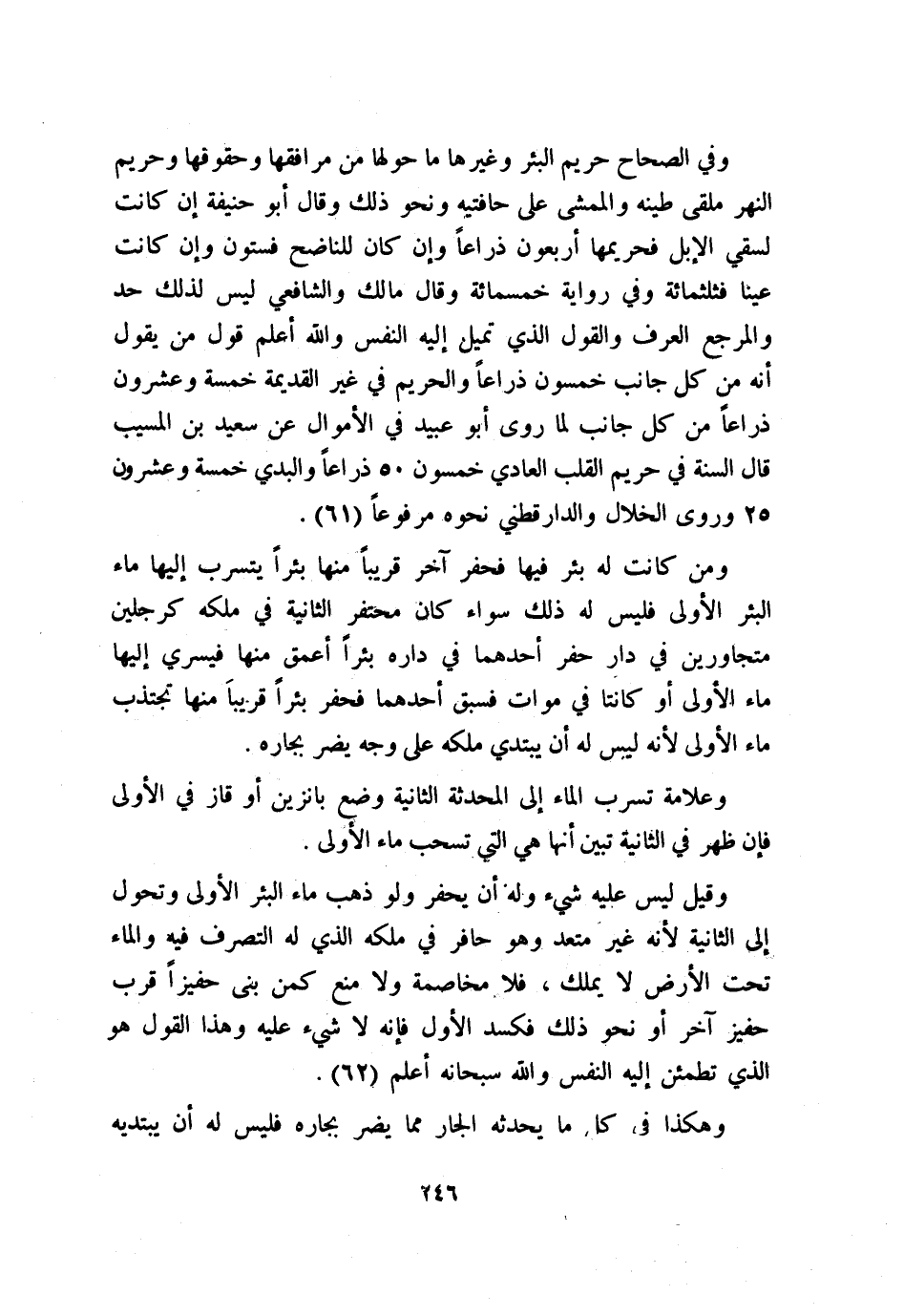 وفي «الصحاح» : حريم البئر وغيرها ما حولها من مرافقها وحقوقها وحريم النهر ملقى طينه والممشى على حافتيه ونحو ذلك، وقال أبو حنيفة: إن كانت لسقي الإبل فحريمها أربعون ذراعًا وإن كان للناضح فستون وإن كانت عينًا فثلاثمائة، وفي رواية خمسمائة، وقال مالك والشافعي: ليس لذلك حد والمرجع العرف، والقول الذي تميل إليه النفس والله أعلم قول من يقول: أنه من كل جانب خمسون ذراعًا، والحريم في غير القديمة خمسة وعشرون ذراعًا من كل جانب لما روى أبو عبيد في الأموال عن سعيد بن المسيب، قال في السُّنة في حريم القلب العادي خمسون 50 ذراعًا، والبدي خمسة وعشرون 25 وروى الخلاف والدارقطني ونحوه مرفوعًا.