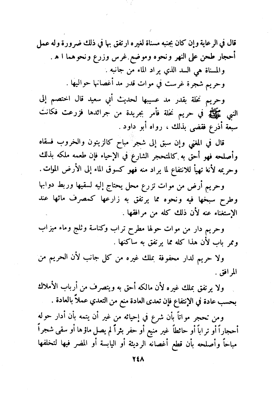 ومن تحجر مواتًا بأن شرع في إحيائه من غير أن يتمه بأن أدار حوله أحجارًا أو ترابًا أو حائطًا غير منيع أو حفر بئرًا لم يصل ماؤها أو سقى شجرًا مباحًا وأصلحه بأن قطع أغصانه الرديئة أو اليابسة أو المضر فيها لتخلفها