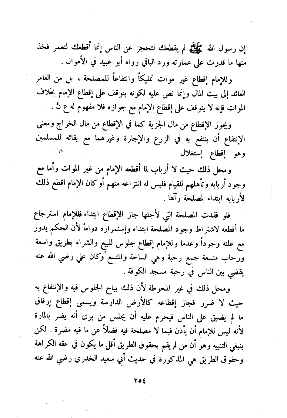 إن رسول الله - صلى الله عليه وسلم - لم يقطعك لتحجز عن الناس، إنما أقطعك لتعمر فخذ منها ما قدرت على عمارته ورد الباقي، رواه أبو عبيد في «الأموال» .