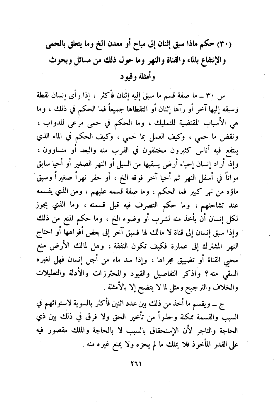 (30) حكم ماذا سبق اثنان إلى مباح أو معدن إلخ وما يتعلق بالحمى والانتفاع بالماء والقناة والنهر وما حول ذلك من مسائل وبحوث