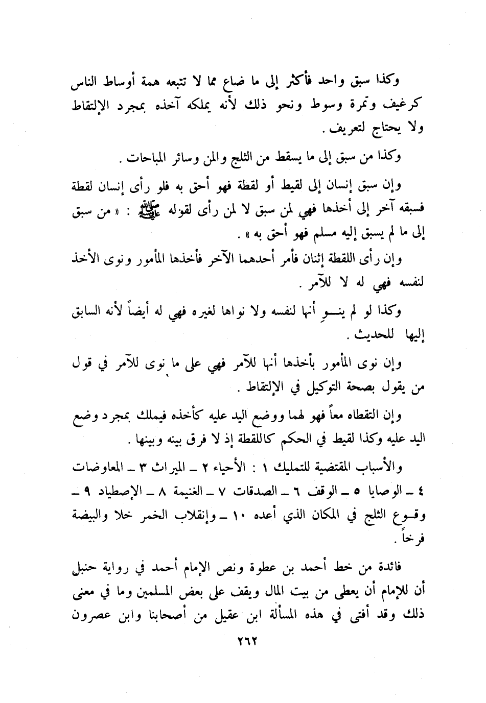 والأسباب المقتضية للتمليك: 1) الإحياء. 2) الميراث. 3) المعاوضات. 4) الوصايا. 5) الوقف. 6) الصدقات. 7) الغنيمة. 8) الإصطياد. 9) وقوع الثلج في المكان الذي أعده. 10) وإنقلاب الخمر خلا والبيضة فرخًا.