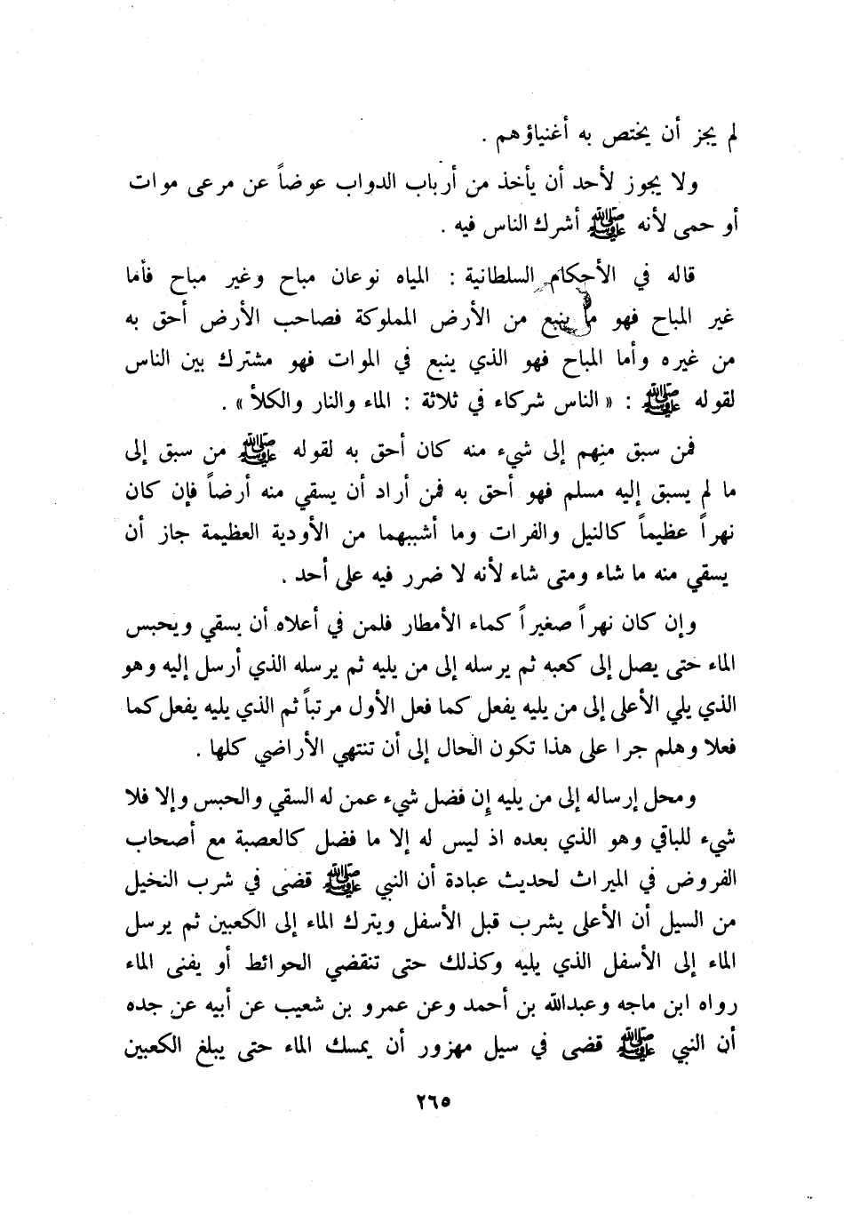 قاله في «الأحكام السلطانية» : المياه نوعان مباح، وغير مباح، فأما غير المباح فهو ما ينبع من الأرض المملوكة فصاحب الأرض أحق به من غيره، وأما المباح فهو الذي ينبع في الموات فهو مشترك بين الناس؛ لقوله - صلى الله عليه وسلم -: «الناس شركاء في ثلاثة: الماء والنار والكلأ» .