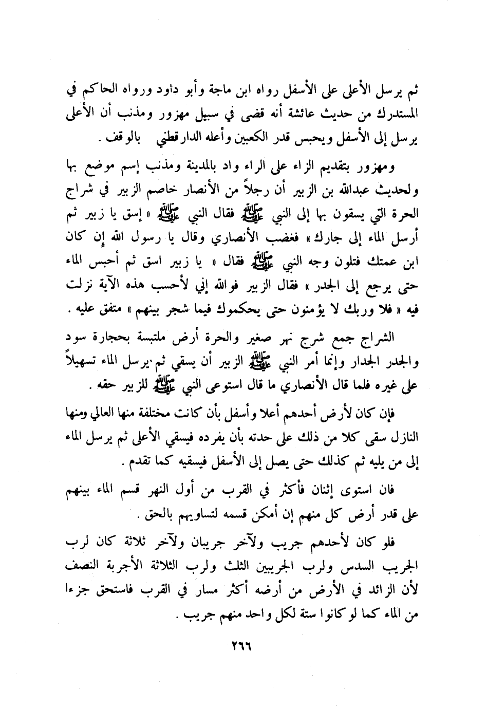 ومهزور بتقديم الزاء على الراء واد بالمدينة ومذنب اسم موضع بها، ولحديث عبد الله بن الزبير أن رجلاً من الأنصار خاصم الزبير في شراج الحرة التي يسقون بها إلى النبي - صلى الله عليه وسلم -، فقال النبي - صلى الله عليه وسلم -: «إسق يا زبير، ثم أرسل الماء إلى جارك» فغضب الأنصاري، وقال: يا رسول الله، إن كان ابن عمتك، فتلون وجه النبي - صلى الله عليه وسلم -، فقال: «يا زبير، اسق ثم أحبس الماء حتى يرجع إلى الجدر» ، فقال الزبير: فوالله إني لأحسب هذه الآية نزلت فيه: {فَلاَ وَرَبِّكَ لاَ يُؤْمِنُونَ حَتَّى يُحَكِّمُوكَ فِيمَا شَجَرَ بَيْنَهُمْ} متفق عليه.