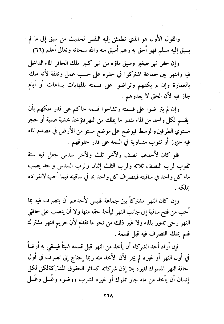 فإن أراد أحد الشركاء أن يأخذ من النهر قبل قسمه شيئًا فيسقي به أرضًا في أول النهر أو غيره لم يجز؛ لأن الأخذ منه ربما احتاج إلى تصرف في أول حافة النهر المملوك لغيره بلا إذن شركائه كسائر الحقوق المشتركة، لكن لكل إنسان أن يأخذ من ماء جار مملوك أو غيره لشرب ووضوء وغُسل وغَسل