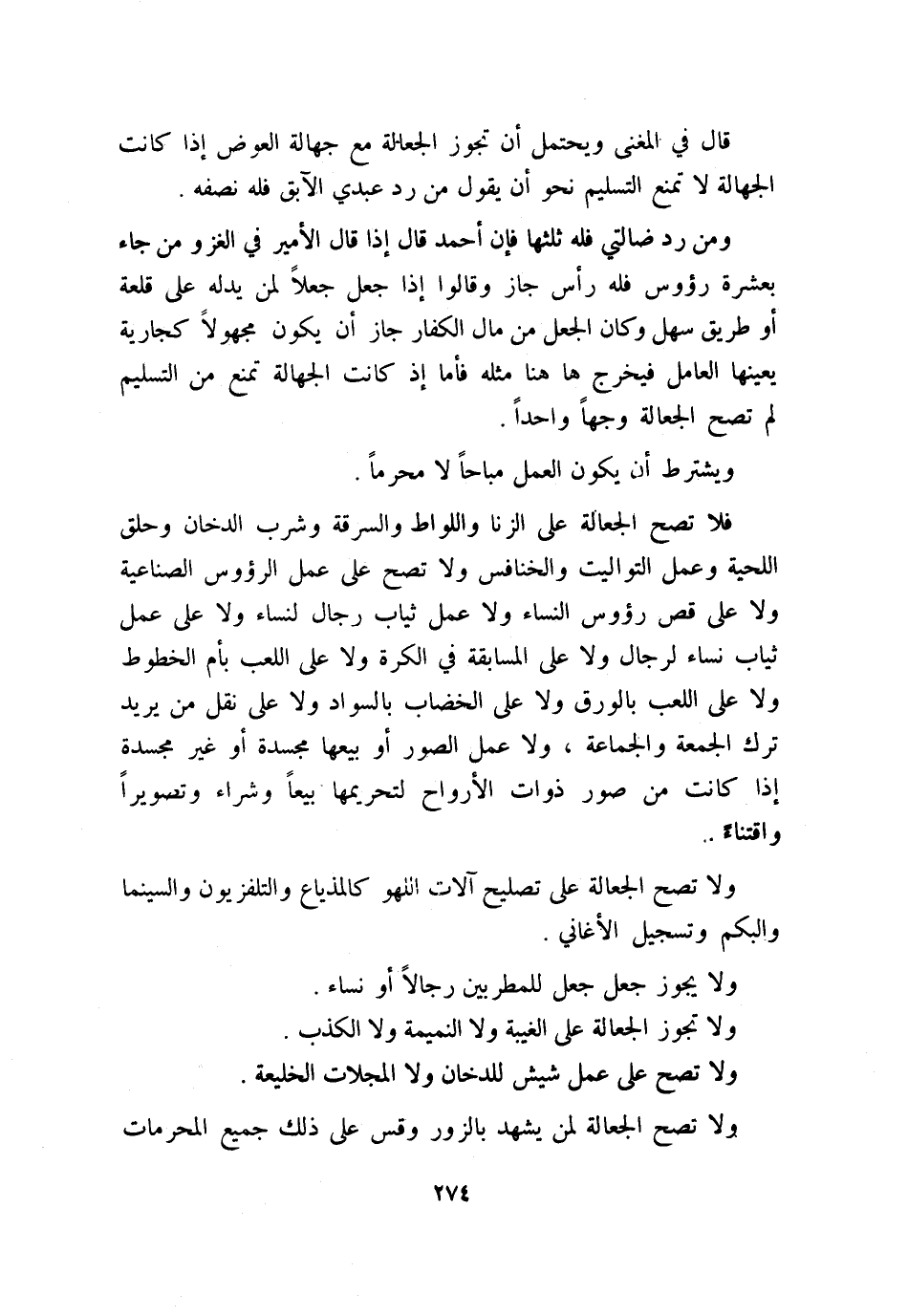 ولا تصح الجعالة على تصليح آلات اللهو كالمذياع والتلفزيون والسينما والبكم وتسجيل الأغاني.