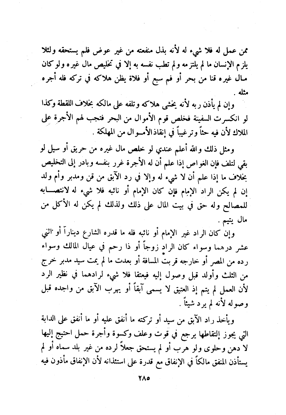 ومثل ذلك، والله أعلم عندي لو خلص مال غيره من حريق أو سيل لو بقي لتلف فإن الغواص إذا علم أن له الأجرة غرر بنفسه وبادر إلى التخليص بخلاف ما إذا علم أن لا شيء له وإلا في رد الآبق من قن ومدبر وأم ولد إن لم يكن الراد الإمام، فإن كان الإمام أو نائبه فلا شيء له لانتصابه للمصالح وله حق في بيت المال على ذلك ولذلك لم يكن له الأكل من مال يتيم.