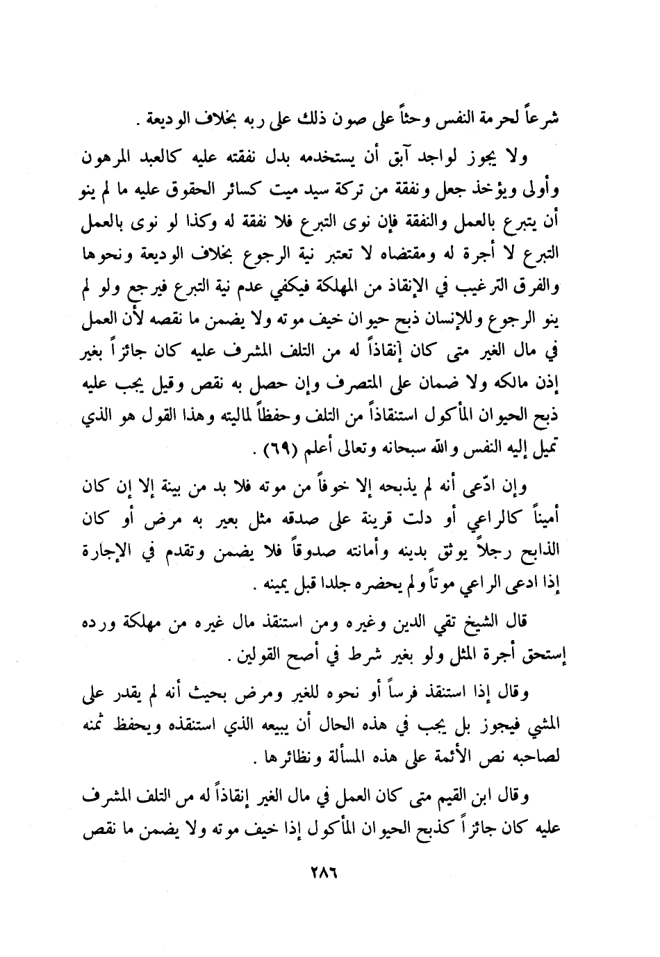 وقال ابن القيم: متى كان العمل في مال الغير إنقاذًا له من التلف المشرف عليه كان جائزًا كذبح الحيوان المأكول إذا خيف موته ولا يضمن ما نقص