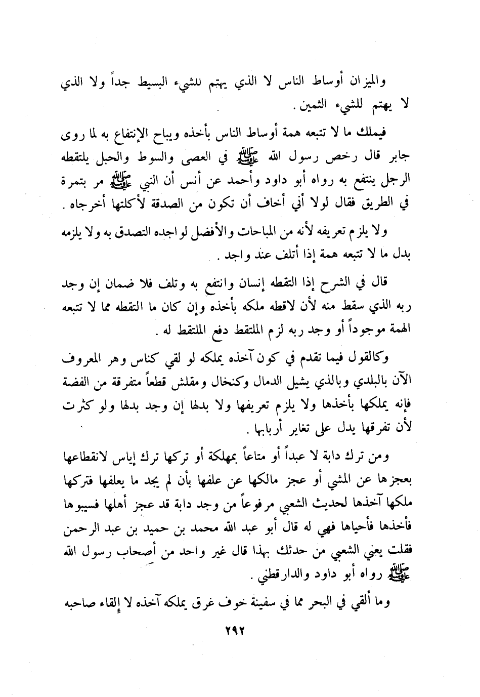 ومن ترك دابة لا عبدًا أو متاعًا بمهلكة أو تركها ترك إياس لانقطاعها بعجزها عن المشي أو عجز مالكها عن علفها بأن لم يجد ما يعلفها فتركها ملكها آخذها؛ لحديث الشعبي مرفوعًا: «من وجد دابة قد عجز أهلها فسيبوها فأخذها فأحياها فهي له» قال أبو عبد الله محمد بن حميد بن عبد الرحمن، فقلت: يعني الشعبي من حدثك بهذا، قال: غير واحد من أصحاب رسول الله - صلى الله عليه وسلم -، رواه أبو داود والدارقطني.