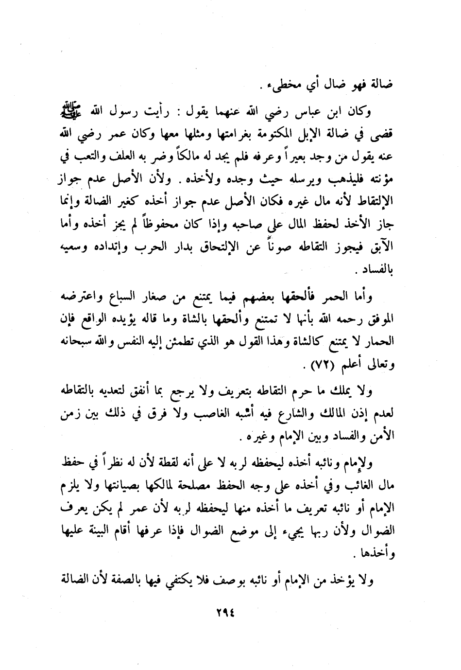 ولإمام ونائبه أخذه ليحفظه لربه لا على أن لقطة؛ لأن له نظرًا في حفظ مال الغائب، وفي أخذه على وجه الحفظ مصلحة لمالكها بصيانتها ولا يلزم الإمام أو نائبه تعريف ما أخذه منها ليحفظه لربه؛ لأن عمر لم يكن يعرف الضوال، ولأن ربها يجيء إلى موضع الضوال، فإذا عرفها أقام البينة عليها وأخذها.