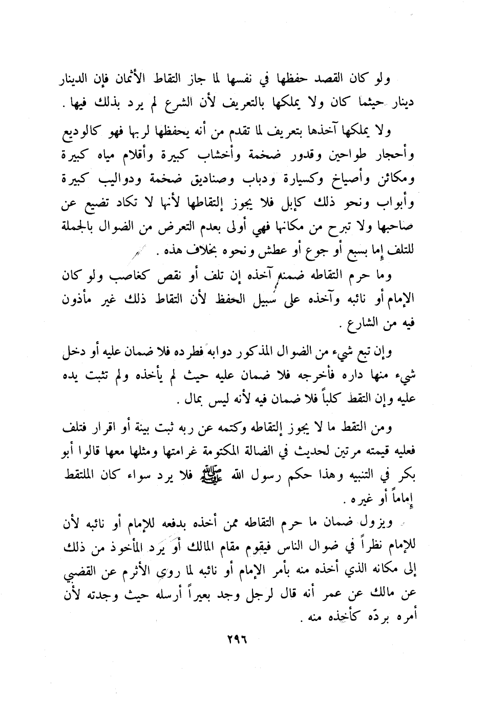 ومن التقط ما لا يجوز إلتقاطه وكتمه عن ربه ثبت بينه أو إقرار فتلف فعليه قيمته مرتين؛ لحديث: «في الضالة المكتومة غرامتها ومثلها معها» قال أبو بكر في التنبيه: وهذا حكم رسول الله - صلى الله عليه وسلم -، فلا يُراد سواء كان الملتقط إمامًا أو غيره.