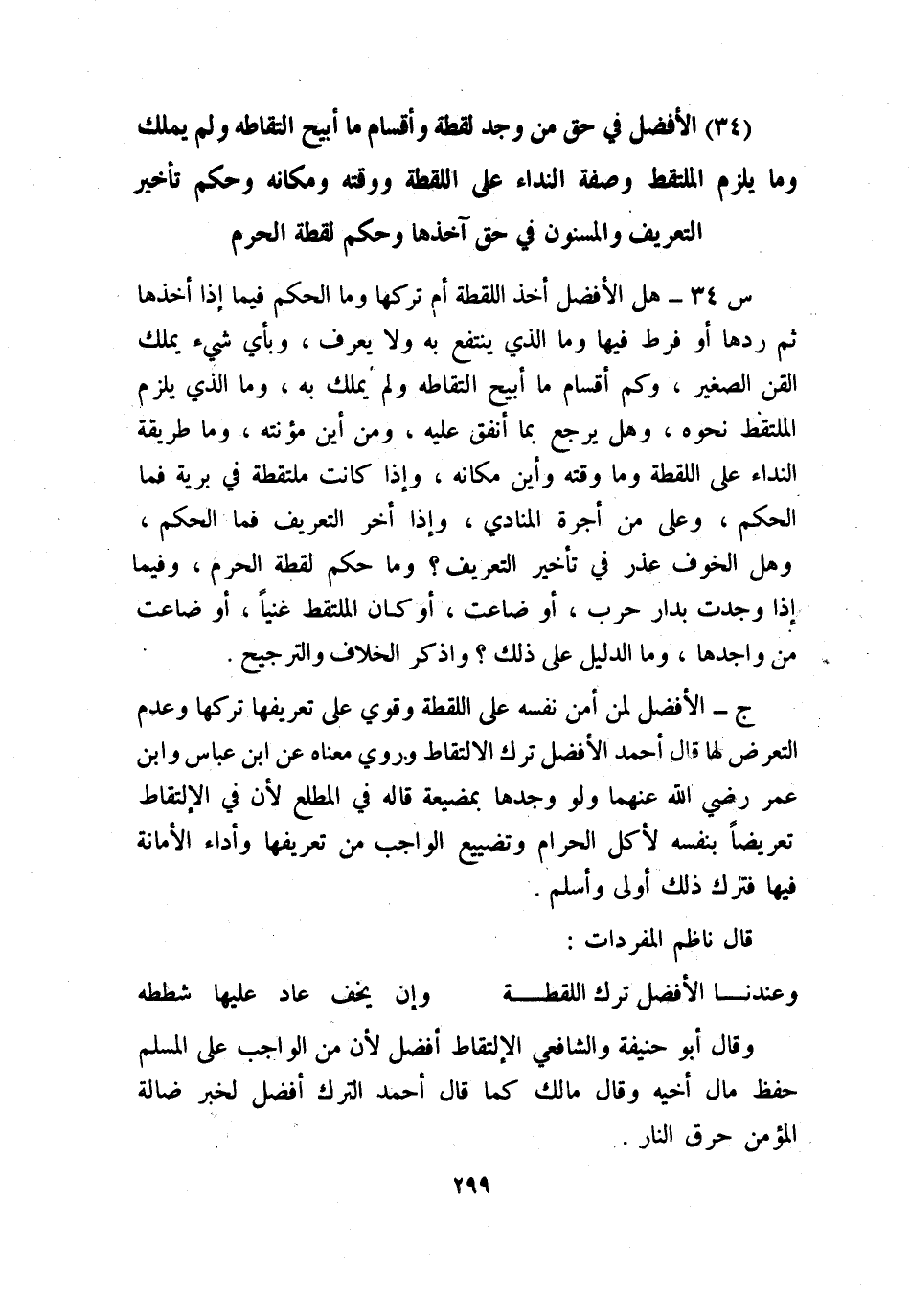 (34) الأفضل في حق من وجد لقطة وأقسام ما أبيح التقاطه ولم يملك وما يلزم الملتقط وصفة النداء على اللقطة ووقته ومكانه وحكم تأخير التعريف