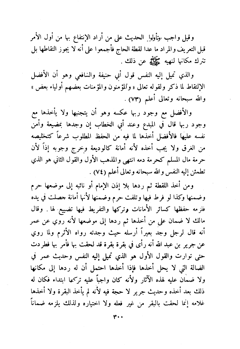والأفضل مع وجود ربها عكسه وهو أن يتجنبها ولا يأخذها مع وجود ربها، قال في «المبدع» : وعند أبي الخطاب إن وجدها بمضيعة وأمن نفسه عليها فالأفضل أخذها لما فيه من الحفظ المطلوب شرعًا كتخليصه من الغرق ولا يجب أخذه؛ لأنه أمانة كالوديعة وخرج وجوبه إذًا؛ لأن حرمة مال المسلم كحرمة دمه، انتهى، والمذهب الأول والقول الثاني هو الذي تطمئن إليه النفس، والله سبحانه وتعالى أعلم.
