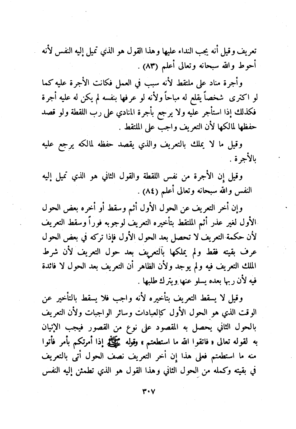 وقيل: لا يسقط التعريف بتأخيره؛ لأنه واجب فلا يسقط بالتأخير عن الوقت الذي هو الحول الأول كالعبادات وسائر الواجبات، ولأن التعريف بالحول الثاني يحصل به المقصود على نوع من القصور فيجب الإتيان به؛ لقوله تعالى: {فَاتَّقُوا اللَّهَ مَا اسْتَطَعْتُمْ} ، وقوله - صلى الله عليه وسلم -: «إذا أمرتكم بأمر فأتوا منه ما استطعتم» ، فعلى هذا إن أخر التعريف نصف الحول أتى بالتعريف في بقيته وكمله من الحول الثاني، وهذا القول هو الذي تطمئن إليه النفس