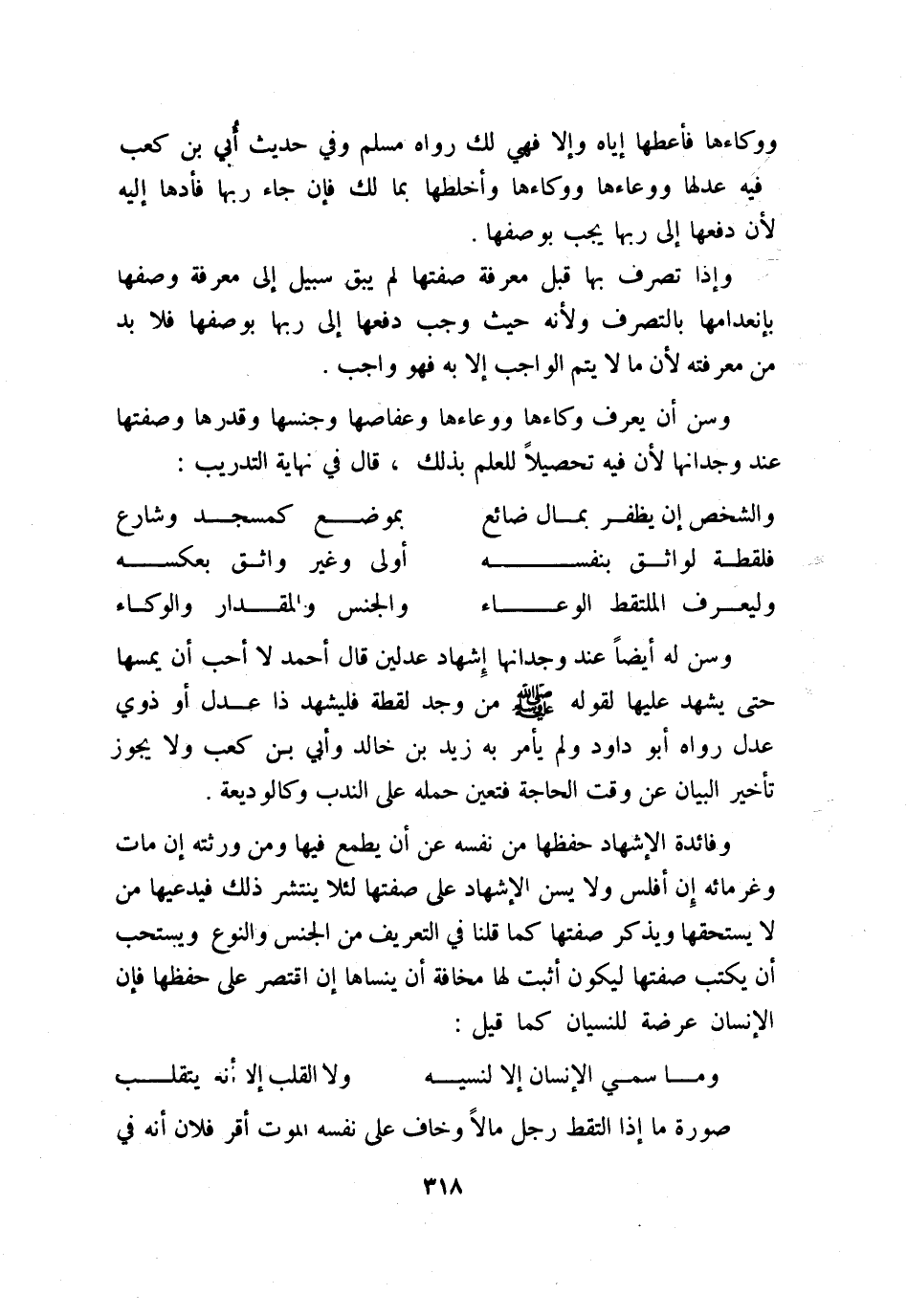 وفائدة الإشهاد حفظها من نفسه عن أن يطمع فيها ومن ورثته إن مات وغرمائه إن أفلس ولا يسن الإشهاد على صفتها لئلا ينتشر ذلك فيدعيها من لا يستحقها ويذكر صفتها كما قلنا في التعريف من الجنس والنوع ويستحب أن يكتب صفتها ليكون أثبت لها مخافة أن ينساها إن اقتصر على حفظها، فإن الإنسان عرضة للنسيان، كما قيل: