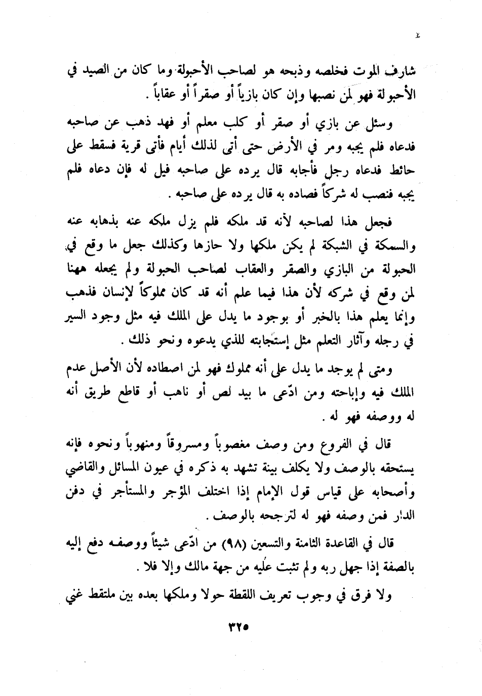 فجعل هذا لصاحبه؛ لأنه قد ملكه فلم يزل ملكه عنه بذهابه عنه والسمكة في الشبكة لم يكن ملكها ولا حازها وكذلك جعل ما وقع في الحبولة من البازي والصقر والعقاب لصاحب الحبولة، ولم يجعله هاهنا لمن وقع في شركه؛ لأن هذا فيما علم أنه قد كان مملوكًا لإنسان فذهب وإنما يعلم هذا بالخبر أو بوجود ما يدل على الملك فيه مثل وجود السير في رجله وآثار التعلم مثل استجابته للذي يدعوه ونحو ذلك.