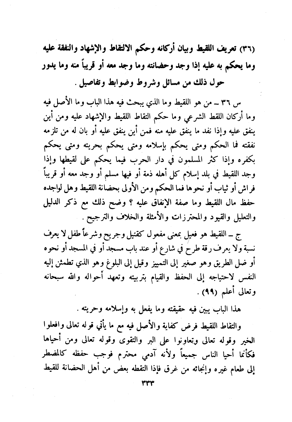 س36: من هو اللقيط؟ وما الذي يبحث فيه هذا الباب؟ وما الأصل فيه؟ وما أركان اللقط الشرعي؟ وما حكم التقاط اللقيط والإشهاد عليه؟ ومن أين ينفق عليه؟ وإذا نفد ما ينفق عليه منه فمن أين ينفق عليه أو بان له من تلزمه نفقته فما الحكم؟ ومتى يحكم بإسلامه؟ ومتى يحكم بحريته؟ ومتى يحكم بكفره وإذا كثر المسلمون في دار الحرب فيما يحكم على لقيطها، وإذا وجد اللقيط في بلد إسلام كل أهله ذمة أو فيها مسلم أو وجد معه أو قريبًا فراش أو ثياب أو نحوها فما الحكم؟ ومن الأولى بحضانة اللقيط؟ وهل لواجده حفظ مال اللقيط؟ وما صفة الإنفاق عليه؟ وضح ذلك مع ذكر الدليل والتعليل والقيود والمحترزات والأمثلة والخلاف والترجيح.