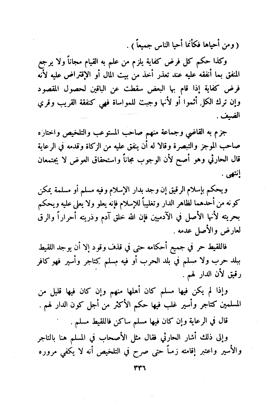 وكذا حكم كل فرض كفاية يلزم من علم به القيام مجانًا ولا يرجع المنفق بما أنفقه عليه عند تعذر أخذ من بيت المال أو الإقتراض عليه؛ لأنه فرض كفاية إذا قام بها البعض سقطت عن الباقين لحصول المقصود وإن ترك الكل أثموا أو لأنها وجبت للمواساة فهي كنفقة القريب وقري الضيف.