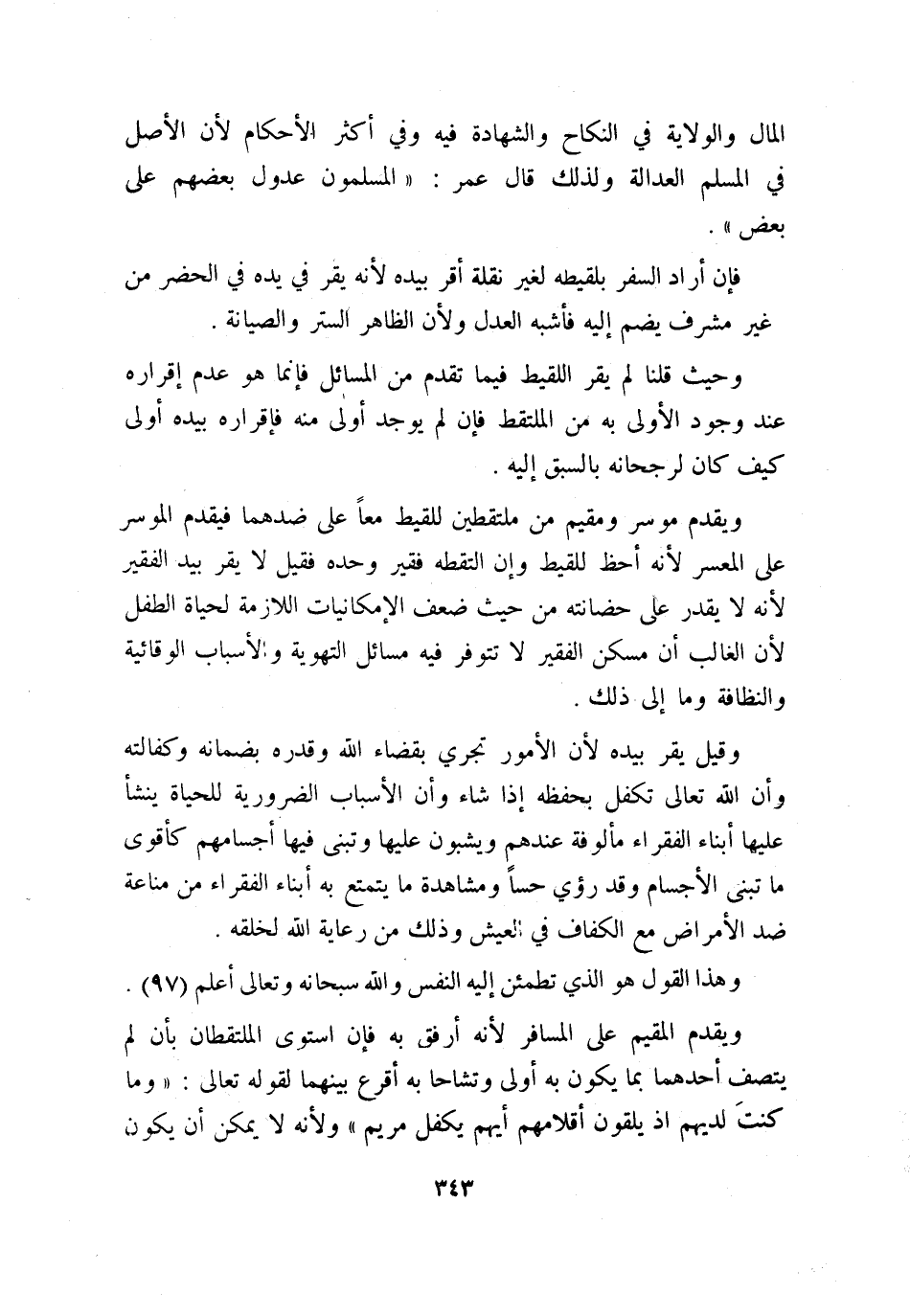 ويقدم المقيم على المسافر؛ لأنه أرفق به فإنه استوى الملتقطان بأن لم يتصف أحدهما بما يكون به أولى وتشاحا به أقرع بينهما؛ لقوله تعالى: {وَمَا كُنتَ لَدَيْهِمْ إِذْ يُلْقُونَ أَقْلامَهُمْ أَيُّهُمْ يَكْفُلُ مَرْيَمَ} ولأنه لا يمكن أن يكون