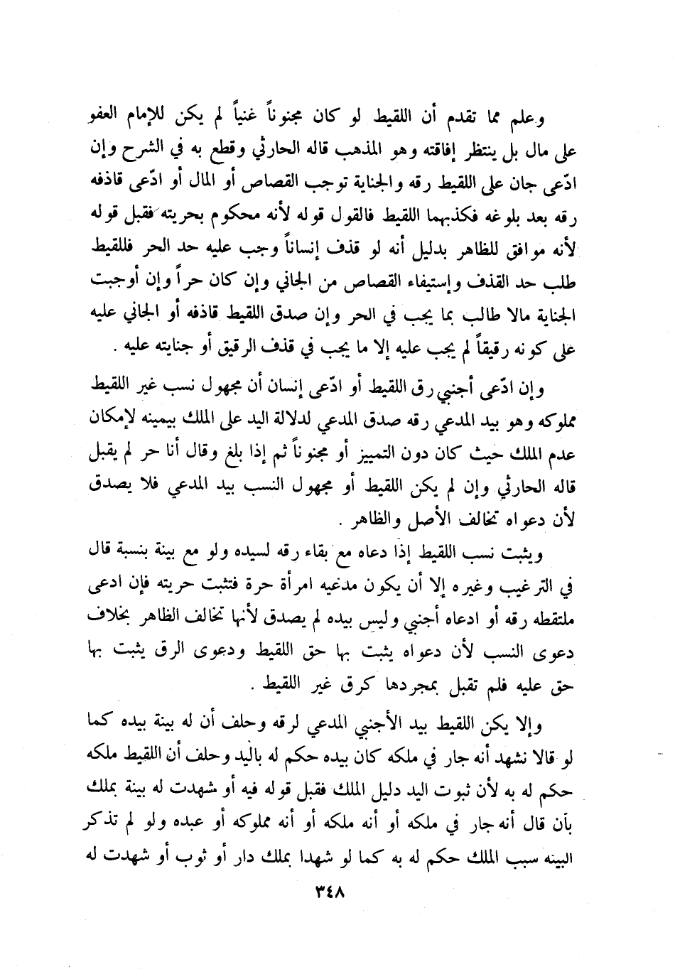 وإن ادّعى جان على اللقيط رقه والجناية توجب القصاص أو المال أو ادّعى قاذفه رقه بعد بلوغه فكذبهما اللقيط، فالقول قوله؛ لأنه محكوم بحريته، فقبل قوله؛ لأنه موافق للظاهر بدليل أنه لو قذف إنسانًا وجب عليه حد الحر فللقيط طلب حد القذف وإستيفاء القصاص من الجاني وإن كان حرًا، وإن أوجبت الجناية مالاً طلب بما يجب في الحر وإن صدق اللقيط قاذفه أو الجاني عليه على كونه رقيقًا لم يجب عليه إلا ما يجب في قذف الرقيق أو جنايته عليه.