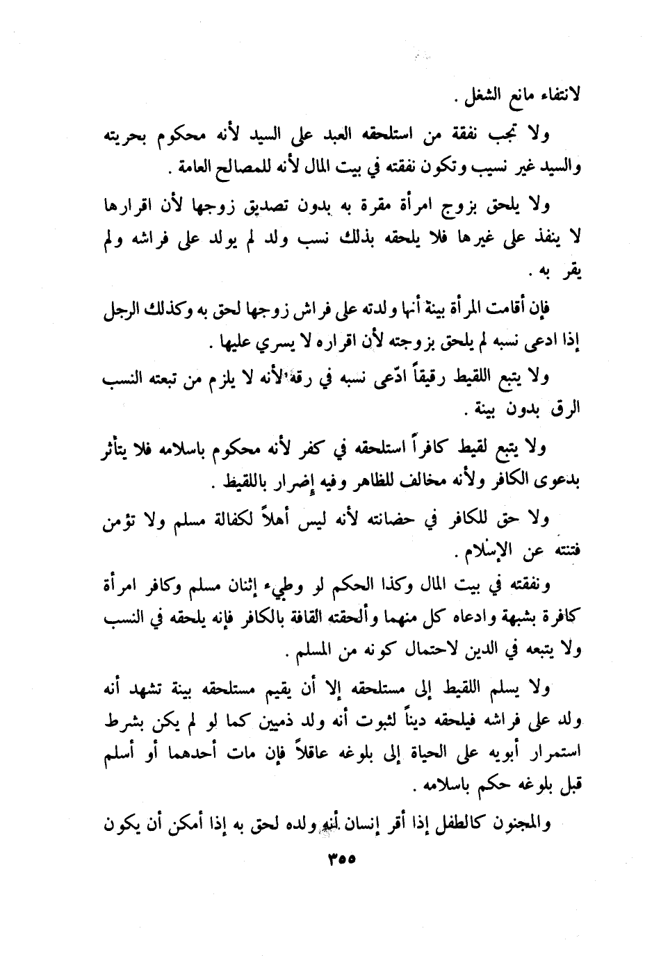 ولا يسلم اللقيط إلى مستلحقه إلا أن يقيم مستلحقه بينة تشهد أنه ولد على فراشه فيلحقه دينًا لثبوت أنه ولد ذميين كما لو لم يكن بشرط استمرار أبويه على الحياة إلى بلوغه عاقلاً، فإن مات أحدهما أو أسلم قبل بلوغه حكم بإسلامه.