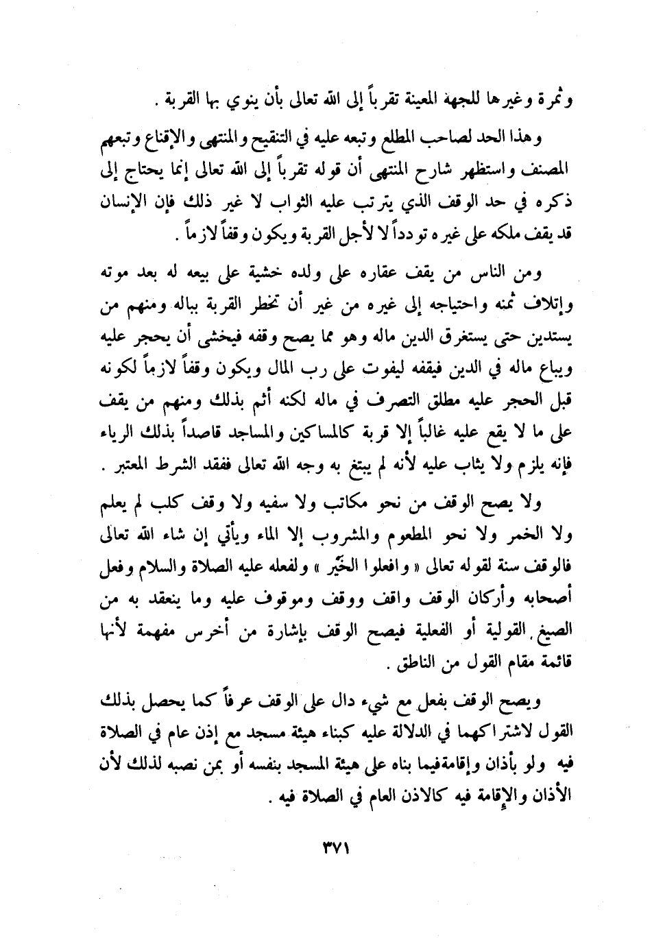ومن الناس من يقف عقاره على ولده خشية على بيعه له بعد موته وإتلاف ثمنه واحتياجه إلى غيره من غير أن تخطر القربة بباله ومنهم من يستدين حتى يستغرق الدين ماله وهو مما يصح وقفه فيخشى أن يحجر عليه ويباع ماله في الدين فيقفه ليفوت على رب المال ويكون وقفًا لازمًا لكونه قبل الحجر عليه مطلق التصرف في ماله لكنه أثم بذلك، ومنهم من يقف على ما لا يقع عليه غالبًا إلا قربة كالمساكين والمساجد قاصدًا بذلك الرياء، فإنه يلزم ولا يثاب عليه؛ لأنه لم يبتغ به وجه الله تعالى ففقد الشرط المعتبر.