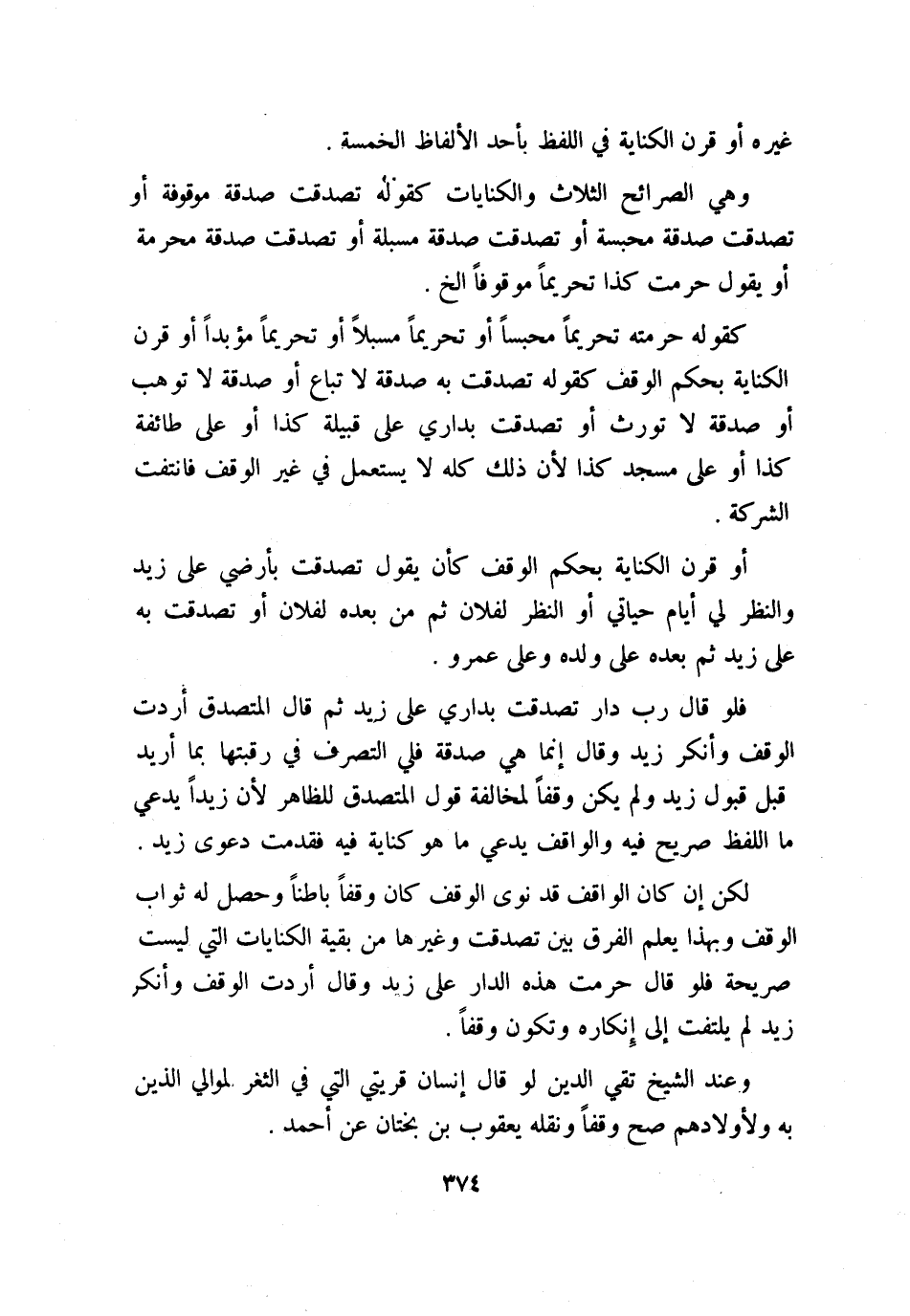 كقوله حرمته تحريمًا محبسًا أو تحريمًا مسبلاً أو تحريمًا مؤبدًا أو قرن الكناية بحكم الوقف، كقوله: تصدقت به صدقة لا تباع أو صدقة لا توهب أو صدقة لا تورث أو تصدقت بداري على قبيلة كذا أو على طائفة كذا أو على مسجد كذا؛ لأن ذلك كله لا يستعمل في غير الوقف فانتفت الشركة.