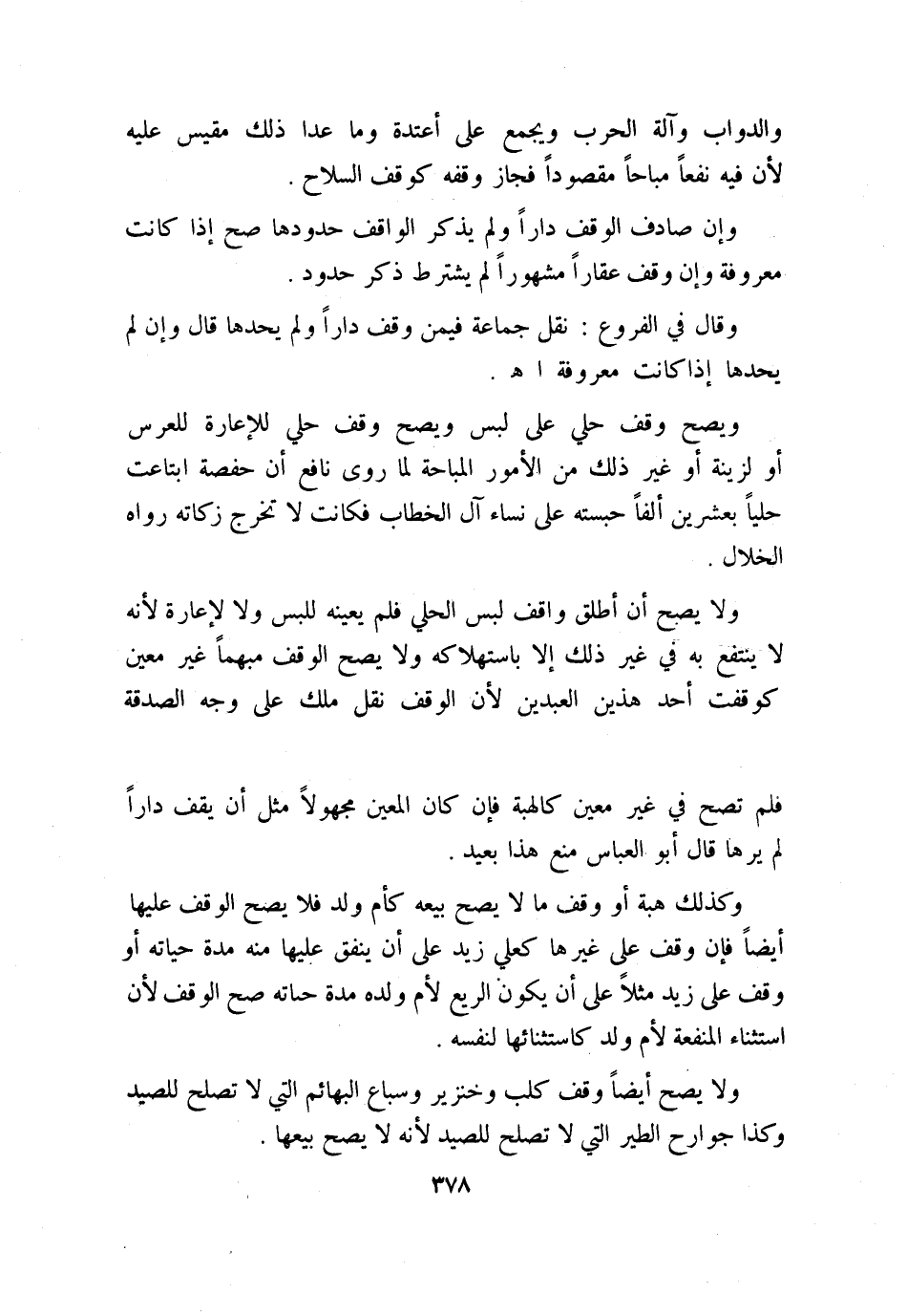 ولا يصح أن أطلق واقف لبس الحلي، فلم يعينه للبس ولا لإعارة؛ لأنه لا ينتفع به في غير ذلك إلا باستهلاكه، ولا يصح الوقف مبهمًا غير معين كوقفت أحد هذين العبدين؛ لأن الوقف نقل ملك على وجه الصدقة.