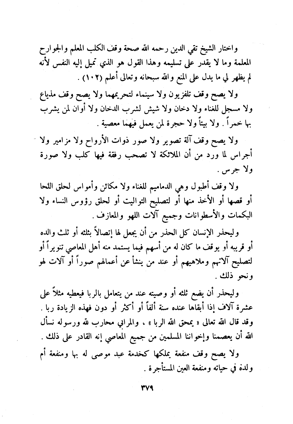 وليحذر الإنسان كل الحذر من أن يجعل لها إتصالاً بثلثه أو ثلث والده أو قريبه أو يوقف ما كان له من أسهم فيما يستمد منه أهل المعاصي تنويرًا أو لتصليح آلاتهم وملاهيهم أو عند من ينشأ عن أعمالهم صورًا وآلات لهو ونحو ذلك.