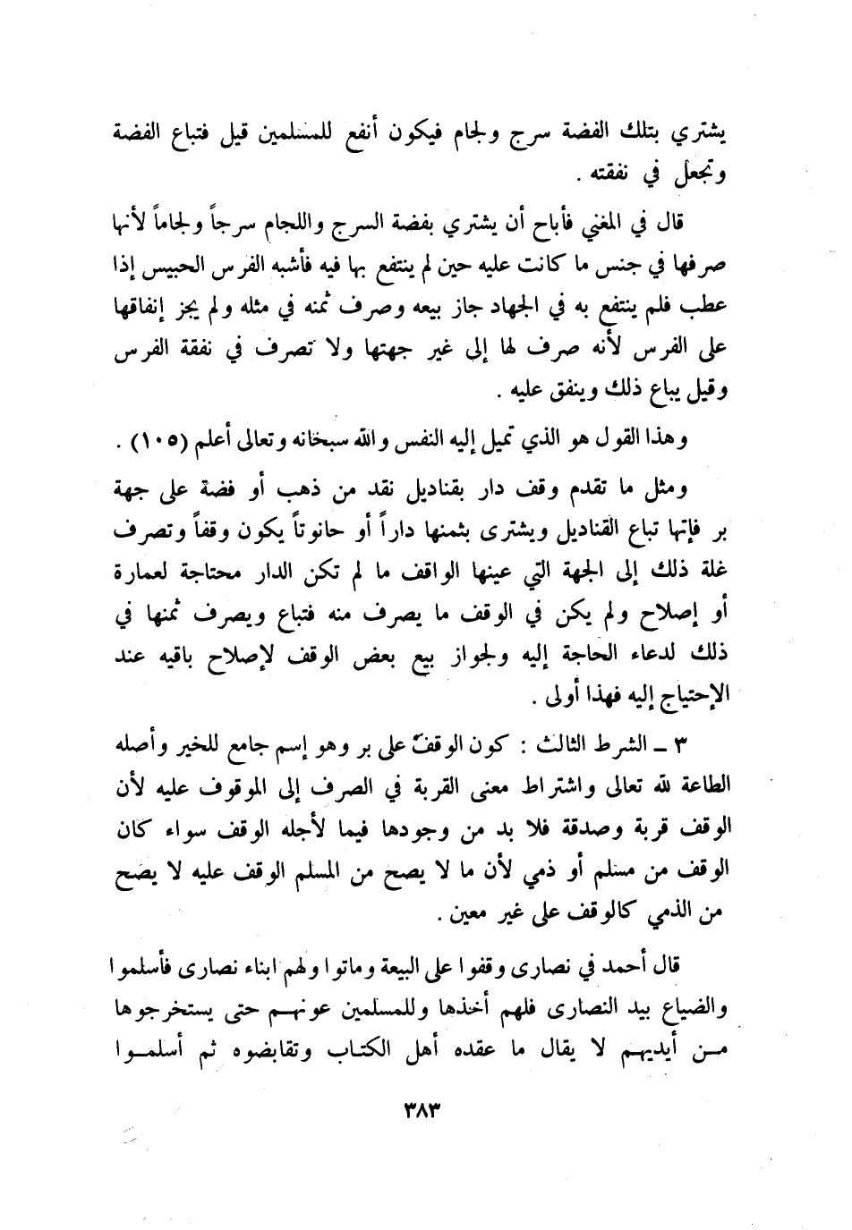 الشرط الثالث: كون الوقف على بر وهو إسم جامع للخير وأصله الطاعة لله تعالى واشتراط معنى القربة في الصرف إلى الموقوف عليه؛ لأن الوقف قربة وصدقة، فلابد من وجودها فيما لأجله الوقف سواء كان الوقف من مسلم أو ذمي؛ لأن ما لا يصح من المسلم الوقف عليه لا يصح من الذمي كالوقف على غير معين.