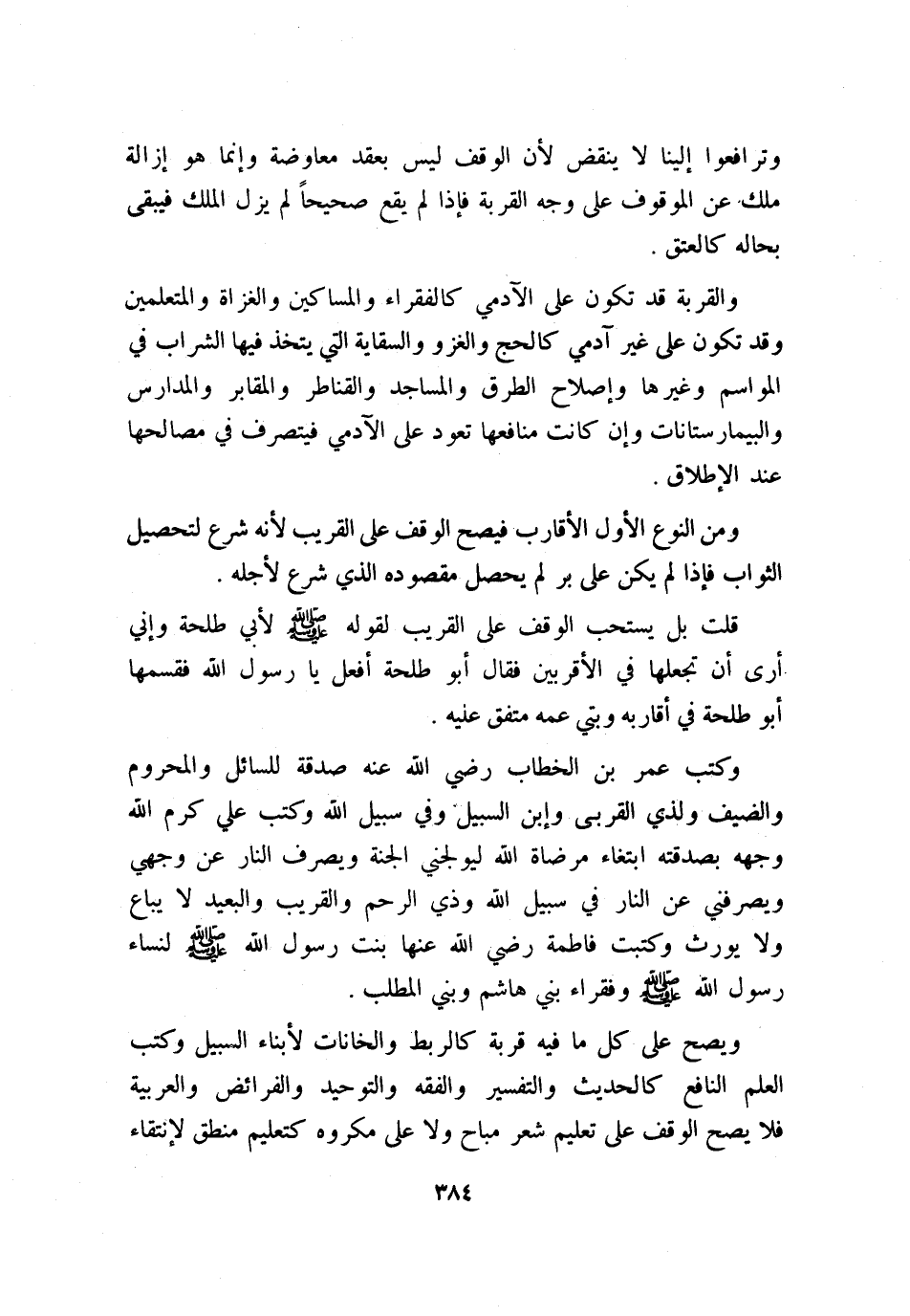 وكتب عمر بن الخطاب - رضي الله عنه -: صدقة للسائل والمحروم والضيف ولذي القربى وابن السبيل، وفي سبيل الله، وكتب علي –كرم الله وجهه- بصدقته ابتغاء مرضاة الله ليولجني الجنة، ويصرف النار عن وجهي ويصرفني عن النار في سبيل الله، وذي الرحم والقريب والبعيد لا يباح ولا يورث، وكتبت فاطمة - رضي الله عنها - بنت رسول الله - صلى الله عليه وسلم - لنساء رسول الله - صلى الله عليه وسلم - وفقراء بني هاشم وبني المطلب.