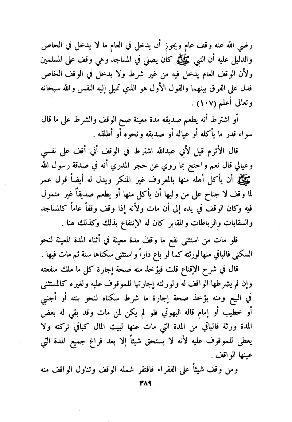 رضي الله عنه وقف عام، ويجوز أن يدخل في العام ما لا يدخل في الخاص، والدليل عليه أن النبي - صلى الله عليه وسلم - كان يصلي في المساجد وهي وقف على المسلمين، ولأن الوقف العام يدخل فيه من غير شرط ولا يدخل في الوقف الخاص فدل على الفرق بينهما، والقول الأول هو الذي تميل إليه النفس، والله سبحانه وتعالى أعلم.