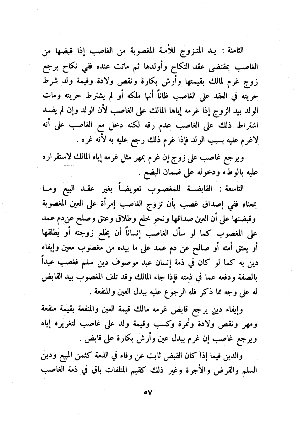 التاسعة: القابضة للمغصوب تعويضًا بغير عقد البيع وما بمعناه ففي إصداق غصب بأن تزوج الغاصب امرأة على العين المغصوبة وقبضتها على أن العين صداقها ونحو خلع وطلاق وعتق وصلح عن دم عمد على المغصوب كما لو سأل الغاصب إنسانًا أن يخلع زوجته أو يطلقها أو يعتق أمته أو صالح عن دم عمد على ما بيده من مغصوب معين وإيفاء دين به كما لو كان في ذمة إنسان عبد موصوف دين سلم فغصب عبدًا بالصفة ودفعه عما في ذمته فإذا جاء المالك وقد تلف المغصوب بيد القابض له على وجه مما ذكر فله الرجوع عليه ببدل العين والمنفعة.