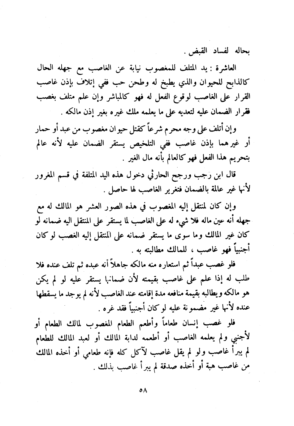 العاشرة: يد المتلف للمغصوب نيابة عن الغاصب مع جهله الحال كالذابح للحيوان والذي يطبخ له وطحن حب ففي إتلاف بإذن غاصب القرار على الغاصب لوقوع الفعل له فهو كالمباشر وإن علم متلف بغصب فقرار الضمان عليه لتعديه على ما يعلمه ملك غيره بغير إذن مالكه.