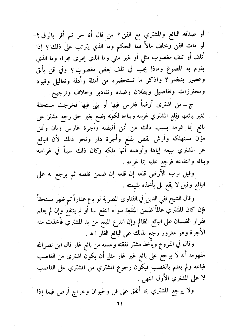 وقال الشيخ تقي الدين في «الفتاوى المصرية» : لو باع عقارًا ثم ظهر مستحقًا فإن كان المشتري عالمًا ضمن المنفعة سواء انتفع بها أو لم ينتفع وإن لم يعلم فقرار الضمان على البائع الظالم وإن انتزع المبيع من يد المشتري فأخذت منه الأجرة وهو مغرور رجع بذلك على البائع الغار. اهـ.