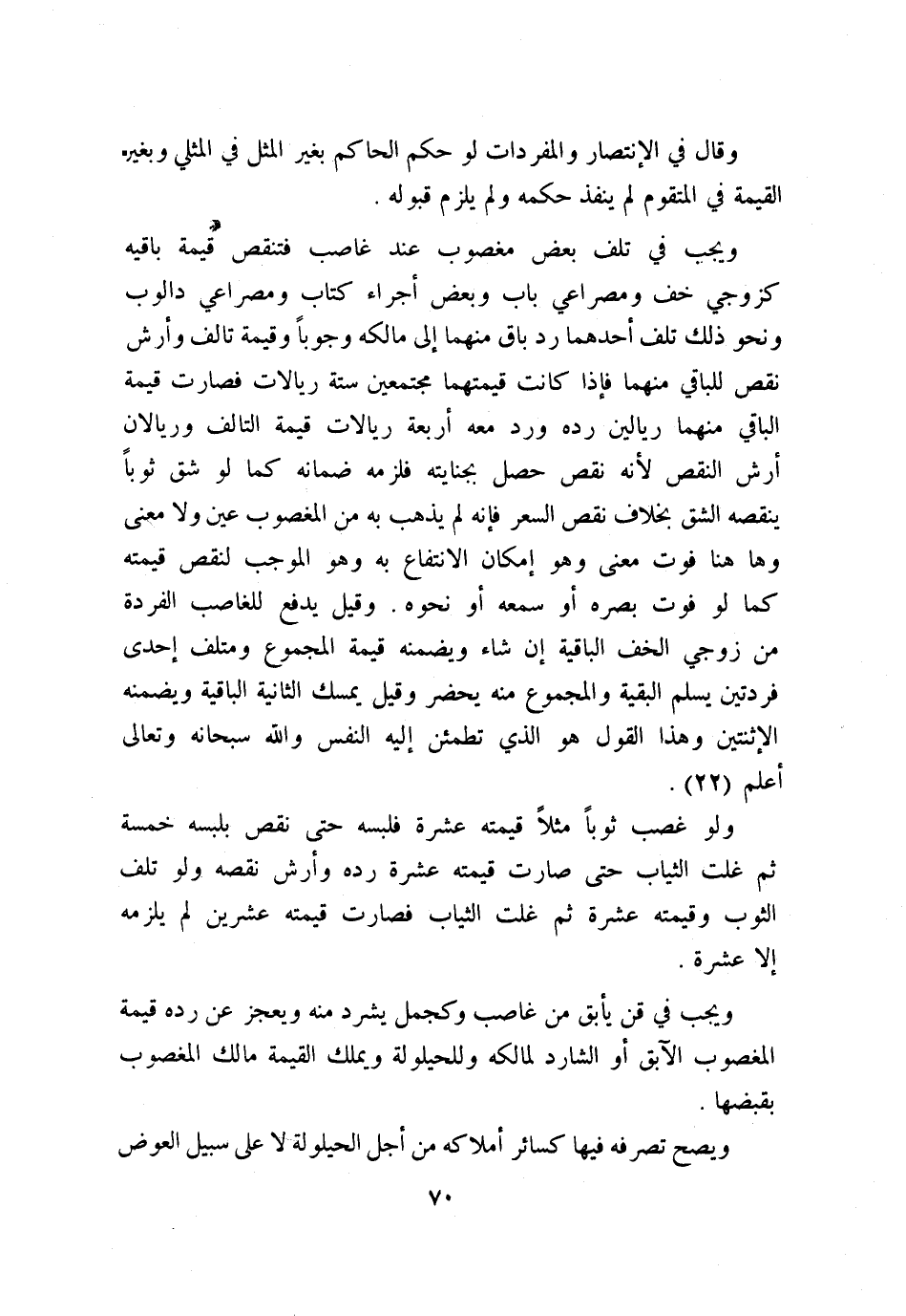 ويجب في تلف بعض مغصوب عند غاصب فتنقص قيمة باقيه كزوجي خف ومصراعي باب وبعض أجزاء كتاب ومصراعي دالوب ونحو ذلك تلف أحدهما رد باق منهما إلى مالكه وجوبًا وقيمة تالف وأرش نقص للباقي منهما فإذا كانت قيمتهما مجتمعين ستة ريالات فصارت قيمة الباقي منهما ريالين رده ورد معه أربعة ريالات قيمة التالف وريالان أرش النقص؛ لأنه نقص حصل بجنايته فلزمه ضمانه كما لو شق ثوبًا بنقصه الشق بخلاف نقص الشعر فإنه لم يذهب به من المغصوب عين ولا معنى وهاهنا فوت معنى وهو إمكان الانتفاع به وهو الموجب لنقص قيمته كما لو فوت بصره أو سمعه أو نحوه، وقيل: يدفع للغاصب الفردة من زوجي الخف الباقية إن شاء ويضمنه قيمة المجموع ومتلف إحدى فردتين يسلم البقية والمجموع منه يحضر، وقيل: يمسك الثانية الباقية ويضمنه الإثنتين، وهذا القول هو الذي تطمئن إليه النفس، والله سبحانه وتعالى أعلم.