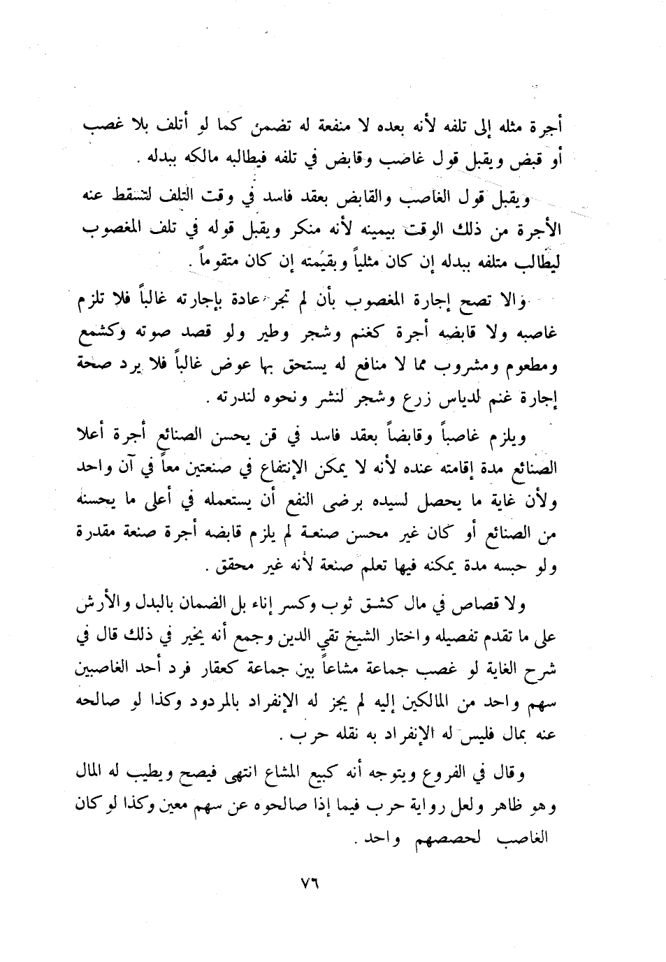 ولا قصاص في مال كشق ثوب وكسر إناء، بل الضمان بالبدل والأرش على ما تقدم تفصيله، واختار الشيخ تقي الدين وجمع أنه يخير في ذلك، قال في «شرح الغاية» : لو غصب جماعة مشاعًا بين جماعة كعقار فرد أحد الغاصبين سهم واحد من المالكين إليه لم يجز له الإنفراد بالمردود، وكذا لو صالحه عنه بمال فليس له الإنفراد به نقله حرب.