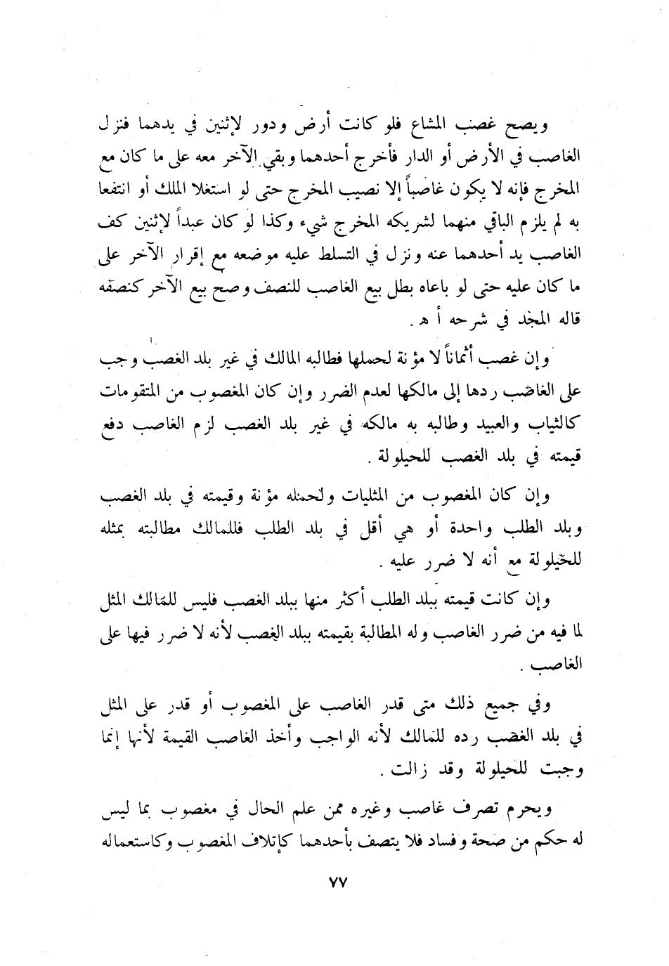 ويصح غصب المشاع فلو كانت أرض ودور لإثنين في يدهما فنزل الغاصب في الأرض أو الدار فأخرج أحدهما وبقي الآخر معه على ما كان مع المخرج، فإنه لا يكون غاصبًا إلا نصيب المخرج حتى لو استغلا الملك أو انتفعا به لم يلزم الباقي منهما لشريكه المخرج شيء، وكذا لو كان عبدًا لإثنين كف الغاصب يد أحدهما عنه ونزل في التسلط عليه موضعه مع إقرار الآخر على ما كان عليه حتى لو باعاه بطل بيع الغاصب للنصف وصح بيع الآخر كنصفه قاله المجد في «شرحه» اهـ.