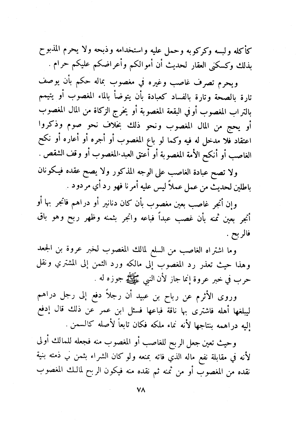 ويحرم تصرف غاصب وغيره في مغصوب بماله حكم بأن يوصف تارة بالصحة وتارة بالفساد كعبادة بأن يتوضأ بالماء المغصوب أو يتيمم بالتراب المغصوب أو في البقعة المغصوبة أو يخرج الزكاة من المال المغصوب أو يحج من المال المغصوب ونحو ذلك بخلاف نحو صوم وذكروا اعتقاد فلا مدخل له فيه، وكما لو باع المغصوب أو أجرة أو أعاره أو نكح الغاصب أو أنكح الأمة المغصوبة أو أعتق العبد المغصوب أو وقف الشقص.
