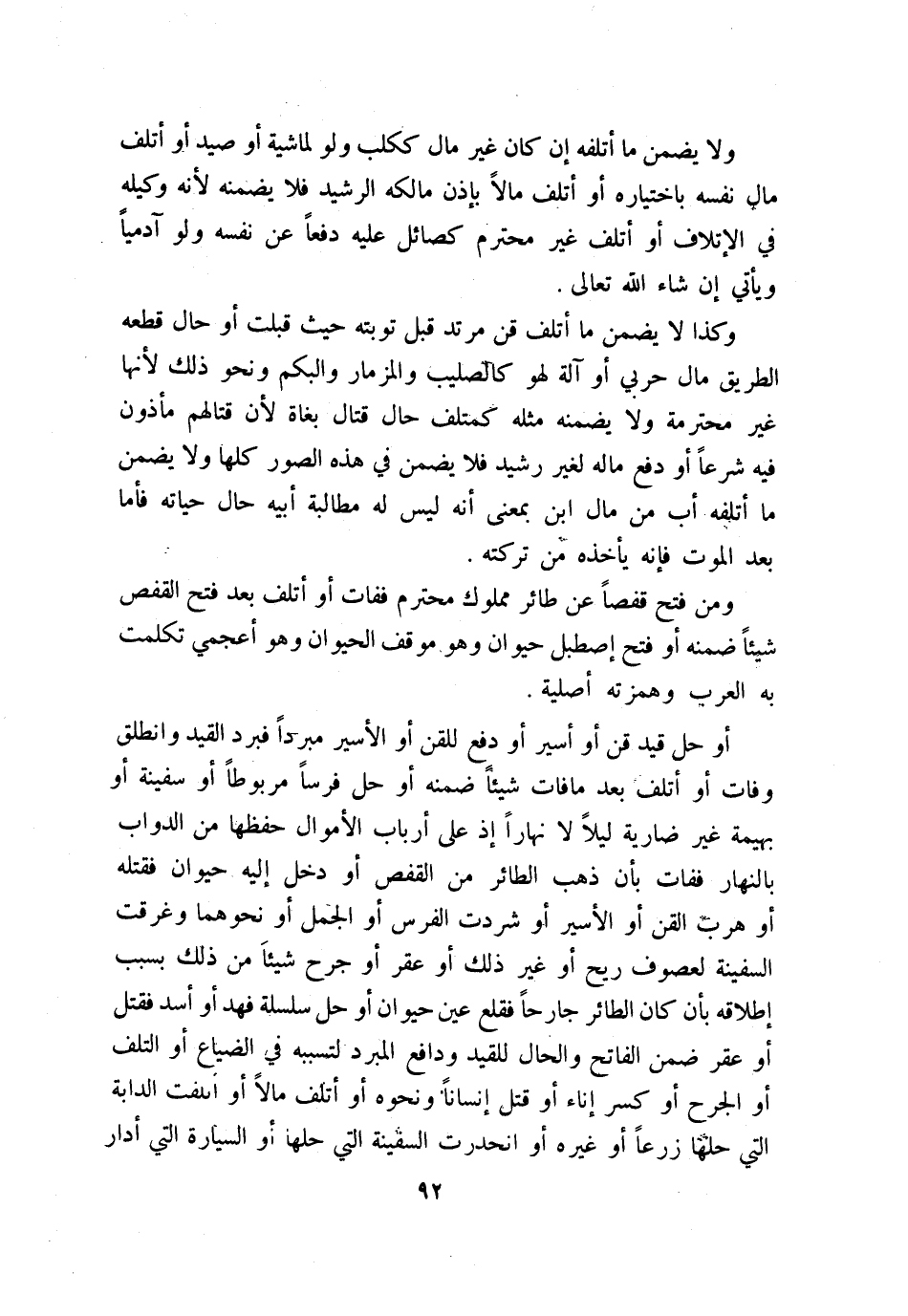أو حل قيد قن أو أسير أو دفع للقن أو الأسير مبردًا فبرد القيد وانطلق وفات أو أتلف بعد ما فات شيئًا ضمنه أو حل فرسًا مربوطًا أو سفينة أو بهيمة غير ضارية ليلاً لا نهارًا إذ على أرباب الأموال حفظها من الدواب بالنهار ففات بأن ذهب الطائر من القفص أو دخل إليه حيوان فقتله أو هرب القن أو الأسير أو شردت الفرس أو الجمل أو نحوهما وغرقت السفينة لعصوف ريح أو غير ذلك أو عقر أو جرح شيئًا من ذلك بسبب إطلاقه بأن كان الطائر جارحًا فقلع عين حيوان أو حل سلسلة فهد أو أسد فقتل أو عفر ضمن الفاتح والحال للقيد ودافع المبرد لتسببه في الضياع أو التلف أو الجرح أو كسر إناء أو قتل إنسانًا ونحوه أو أتلف مالاً أو أتلفت الدابة التي حلها زرعًا أو غيره أو انحدرت السفينة التي حلها أو السيارة التي أدار