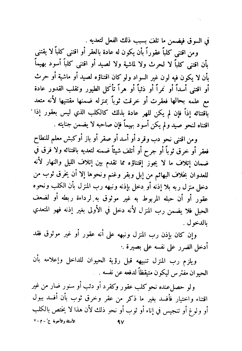 ومن اقتنى كلبًا عقورًا بأن يكون له عادة بالعقر أو اقتنى كلبًا لا يقتنى بأن اقتنى كلبًا لا لحرث ولا لماشية ولا لصيد أو اقتنى كلبًا أسود بهيمًا بأن لا يكون فيه لون غير السواد ولو كان اقتناؤه لصيد أو ماشية أو حرث أو اقتنى أسدًا أو نمرًا أو ذئبًا أو هرًا تأكل الطيور وتقلب القدور عادة مع علمه بحالها فعقرت أو خرقت ثوبًا بمنزله ضمنها مقتنيها؛ لأنه تعد باقتنائه إذًا فإن لم يكن للهر عادة بذلك كالكلب الذي ليس بعقور إذا اقتناه لنحو صيد ولم يكن أسود بهيمًا فإن صاحبه لا يضمن جنايته.