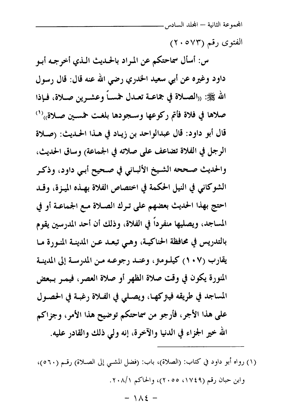 س: أسأل سماحتكم عن المراد بالحديث الذي أخرجه أبو داود وغيره عن أبي سعيد الخدري رضي الله عنه قال: قال رسول الله صلى الله عليه وسلم: «الصلاة في جماعة تعدل خمسا وعشرين صلاة، فإذا صلاها في فلاة فأتم ركوعها وسجودها بلغت خمسين صلاة (¬1) » قال أبو داود: قال عبد الواحد بن زياد في هذا الحديث: «صلاة الرجل في الفلاة تضاعف على صلاته في الجماعة» وساق الحديث، والحديث صححه الشيخ الألباني في صحيح أبي داود، وذكر الشوكاني في النيل الحكمة في اختصاص الفلاة بهذه الميزة، وقد احتج بهذا الحديث بعضهم على ترك الصلاة مع الجماعة أو في المساجد، ويصليها منفردا في الفلاة، وذلك أن أحد المدرسين يقوم بالتدريس في محافظة الحناكية، وهي تبعد عن المدينة المنورة ما يقارب (107) كيلو متر، وعند رجوعه من المدرسة إلى المدينة المنورة يكون في وقت صلاة الظهر أو صلاة العصر، فيمر ببعض المساجد في طريقه فيتركها، ويصلي في الفلاة رغبة في الحصول على هذا الأجر، فأرجو من سماحتكم توضيح هذا الأمر، وجزاكم الله خير الجزاء في الدنيا والآخرة، إنه ولي ذلك والقادر عليه.