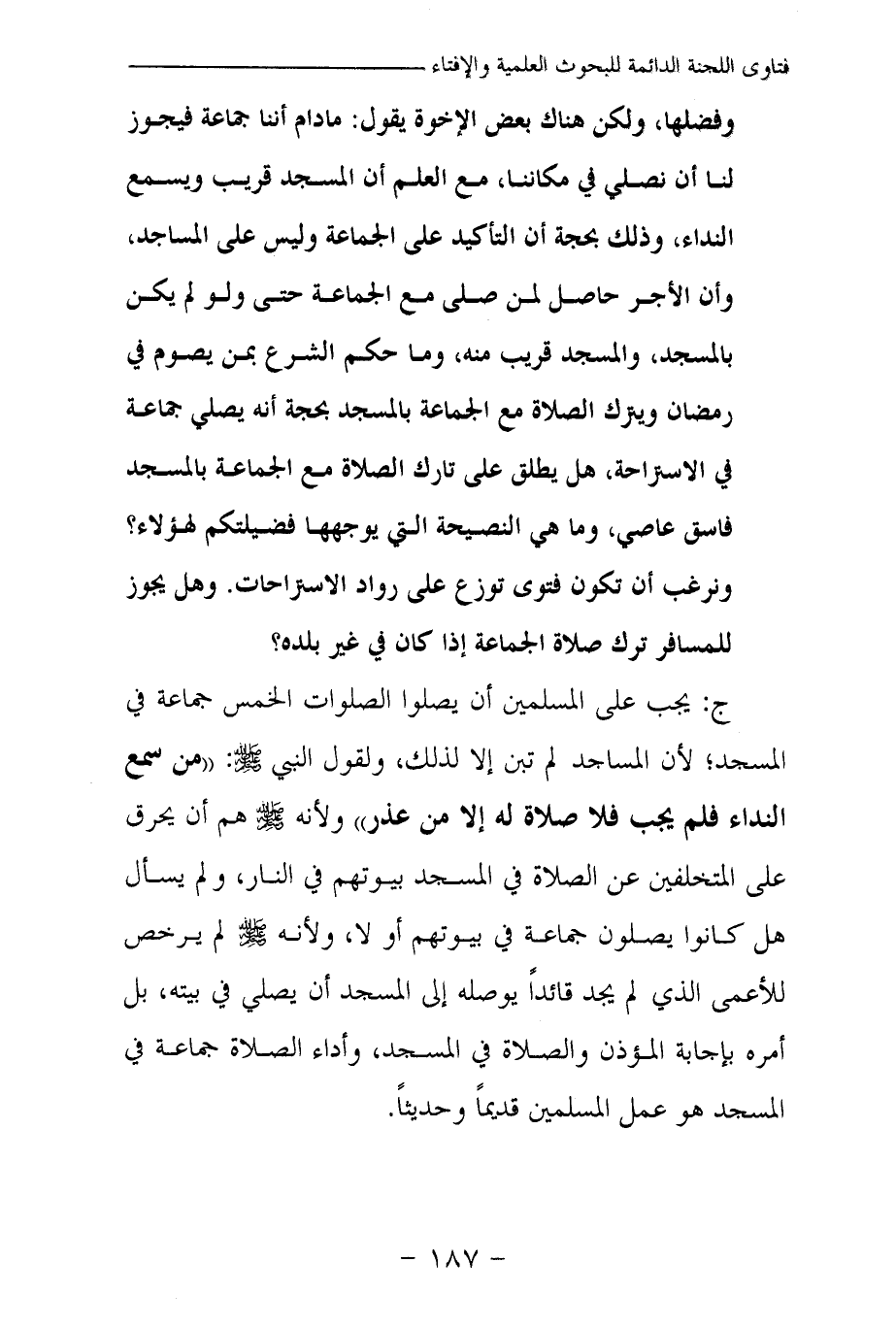 وفضلها، ولكن هناك بعض الإخوة يقول: ما دام أننا جماعة فيجوز لنا أن نصلي في مكاننا، مع العلم أن المسجد قريب ويسمع النداء، وذلك بحجة أن التأكيد على الجماعة وليس على المساجد، وأن الأجر حاصل لمن صلى مع الجماعة حتى ولو لم يكن بالمسجد، والمسجد قريب منه، وما حكم الشرع بمن يصوم في رمضان ويترك الصلاة مع الجماعة بالمسجد بحجة أنه يصلي جماعة في الاستراحة، هل يطلق على تارك الصلاة مع الجماعة بالمسجد فاسق عاص، وما هي النصيحة التي يوجهها فضيلتكم لهؤلاء؟ ونرغب أن تكون فتوى توزع على رواد الاستراحات وهل يجوز للمسافر ترك صلاة الجماعة إذا كان في غير بلده؟