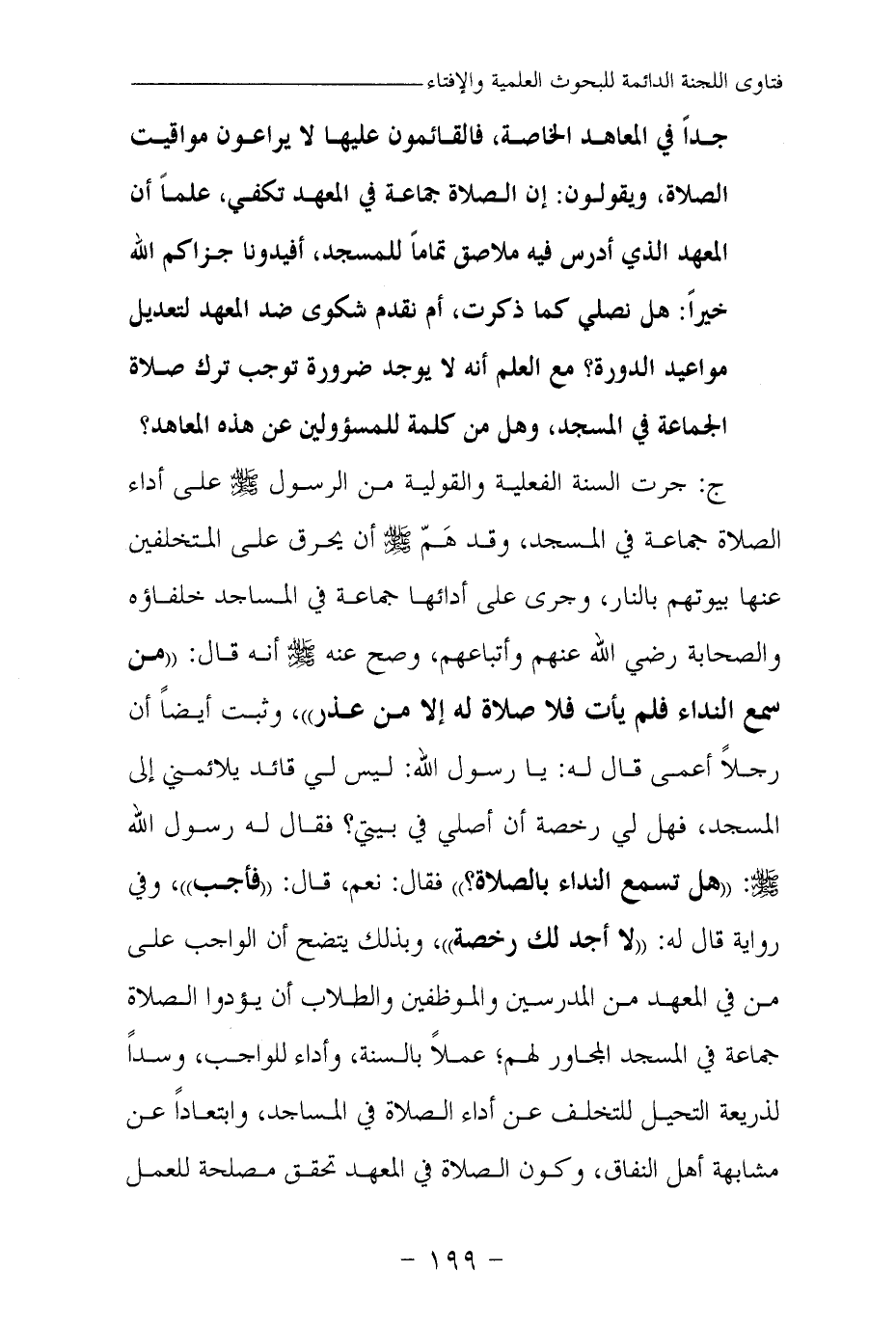 ج: جرت السنة الفعلية والقولية من الرسول صلى الله عليه وسلم على أداء الصلاة جماعة في المسجد، وقد هم صلى الله عليه وسلم أن يحرق على المتخلفين عنها بيوتهم بالنار، وجرى على أدائها جماعة في المساجد خلفاؤه والصحابة رضي الله عنهم وأتباعهم، وصح عنه صلى الله عليه وسلم أنه قال: «من سمع النداء فلم يأت فلا صلاة له إلا من عذر (¬1) » ، وثبت أيضا أن رجلا أعمى قال له: «يا رسول الله: ليس لي قائد يلائمني إلى المسجد، فهل لي رخصة أن أصلي في بيتي؟ فقال له رسول الله صلى الله عليه وسلم (هل تسمع النداء بالصلاة؟) فقال: نعم، قال: (فأجب (¬2) » ، وفي رواية قال له: «لا أجد لك رخصة (¬3) » ، وبذلك يتضح أن الواجب على من في المعهد من المدرسين والموظفين والطلاب أن يؤدوا الصلاة جماعة في المسجد المجاور لهم، عملا بالسنة، وأداء للواجب، وسدا لذريعة التحيل للتخلف عن أداء الصلاة في المساجد، وابتعادا عن مشابهة أهل النفاق، وكون الصلاة في المعهد تحقق مصلحة للعمل