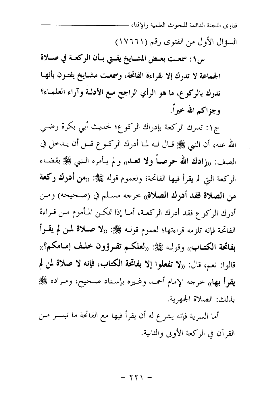 س1: سمعت بعض المشايخ يفتي بأن الركعة في صلاة الجماعة لا تدرك إلا بقراءة الفاتحة، وسمعت مشايخ يفتون بأنها تدرك بالركوع، ما هو الرأي الراجح مع الأدلة وآراء العلماء؟ وجزاكم الله خيرا.