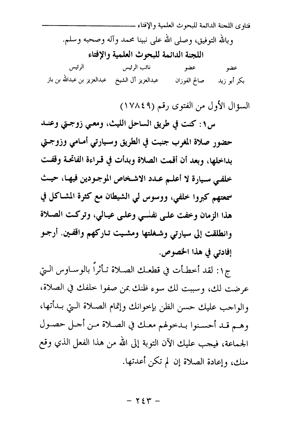 س 1: كنت في طريق الساحل الليث، ومعي زوجتي وعند حضور صلاة المغرب جنبت في الطريق وسيارتي أمامي وزوجتي بداخلها، وبعد أن أقمت الصلاة وبدأت في قراءة الفاتحة وقفت خلفي سيارة لا أعلم عدد الأشخاص الموجودين فيها، حيث سمعتهم كبروا خلفي، ووسوس لي الشيطان مع كثرة المشاكل في هذا الزمان وخفت على نفسي وعلى عيالي، وتركت الصلاة وانطلقت إلى سيارتي وشغلتها ومشيت تاركهم واقفين أرجو إفادتي في هذا الخصوص.